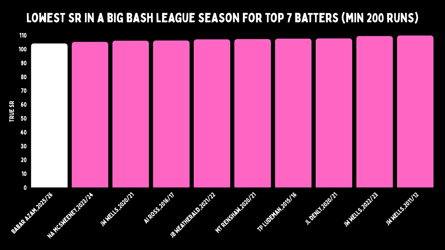 Unfortunately for the Sixers and Babar, neither his skill nor his experience could stop him from having the slowest season for any batter with at least 200 runs. Look at the names on this graph. Nathan McSweeney and Jonathan Wells strike at 42 in first-class cricket. That is not ideal company to be in during a T20 conversation.