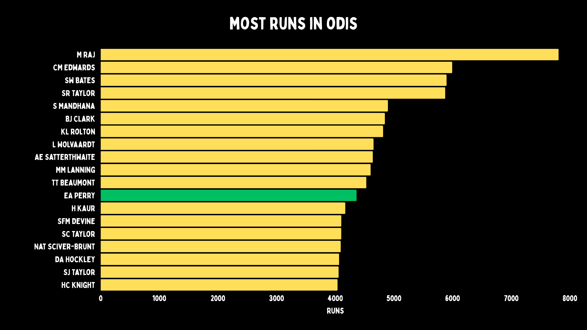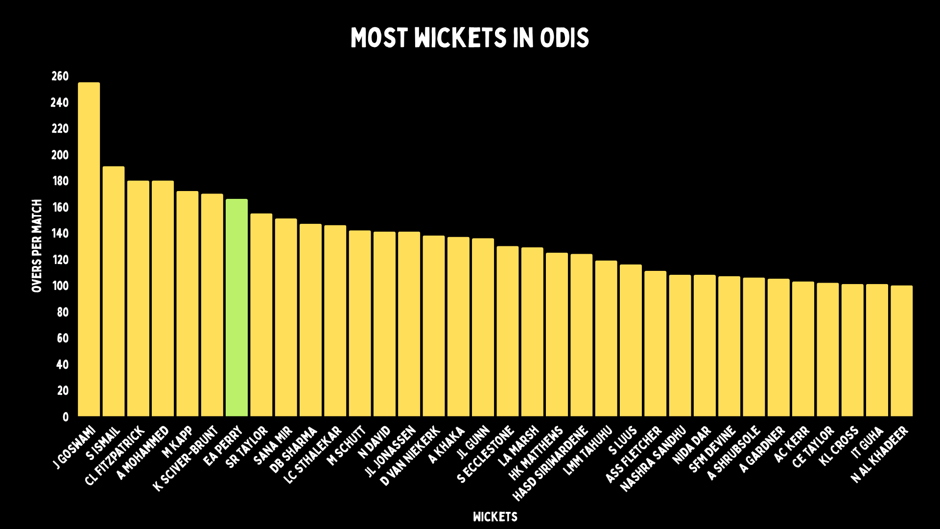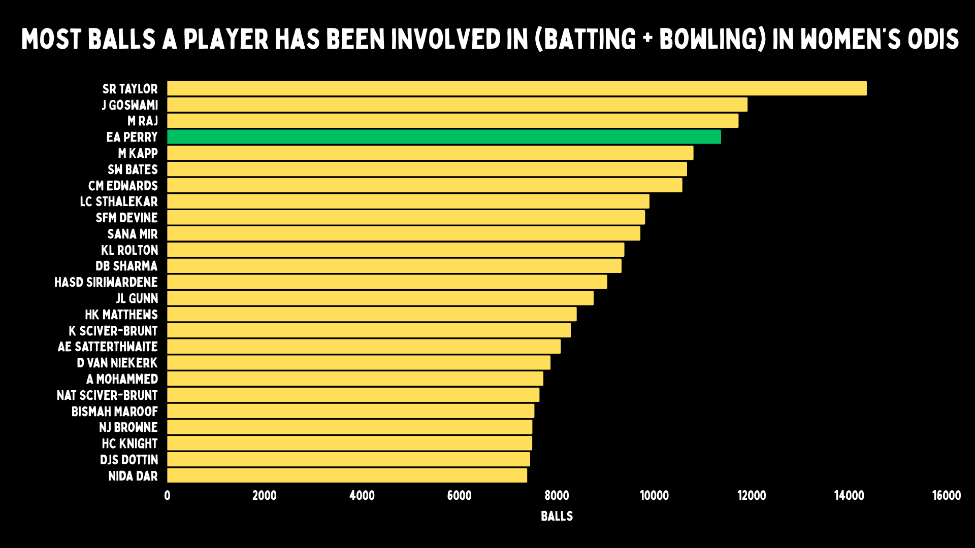 Perry also has the seventh-most wickets ever in ODIs. Even as her load eased recently, she remains one of the most-used bowlers of all time, with a fantastic 12-year run as a frontline seamer.