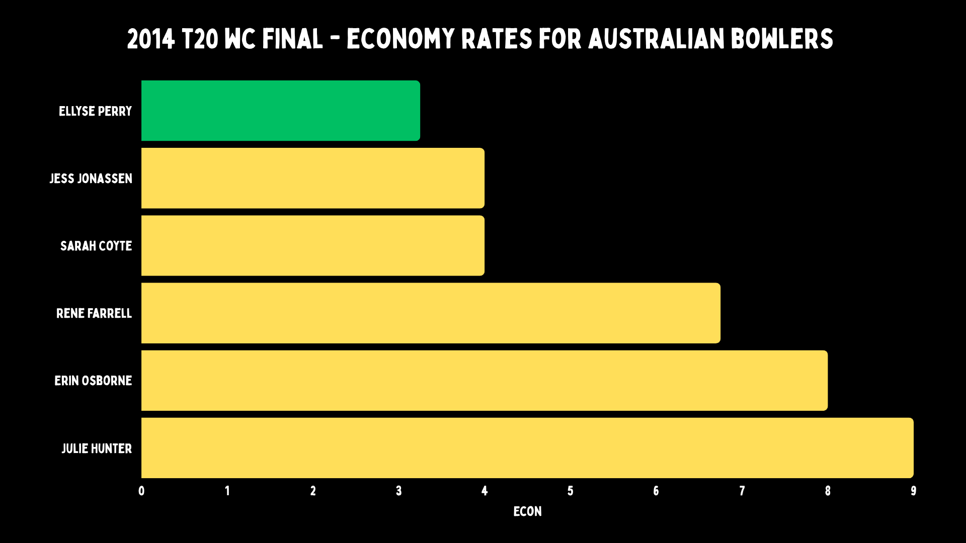 In the 2014 World Cup final, Perry bowls first change. England are already struggling when she comes on, but her wicket of Lydia Greenway puts them a long way back. Later, she takes Amy Jones too.