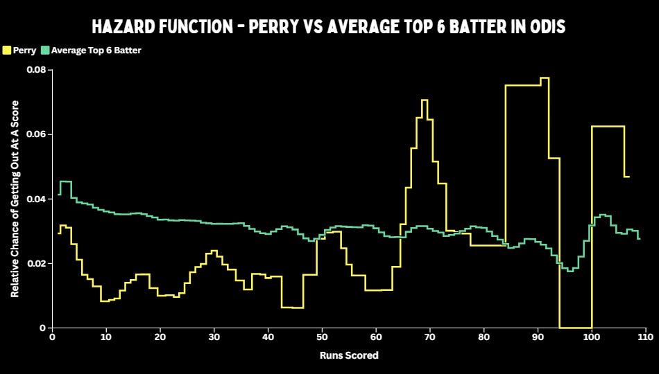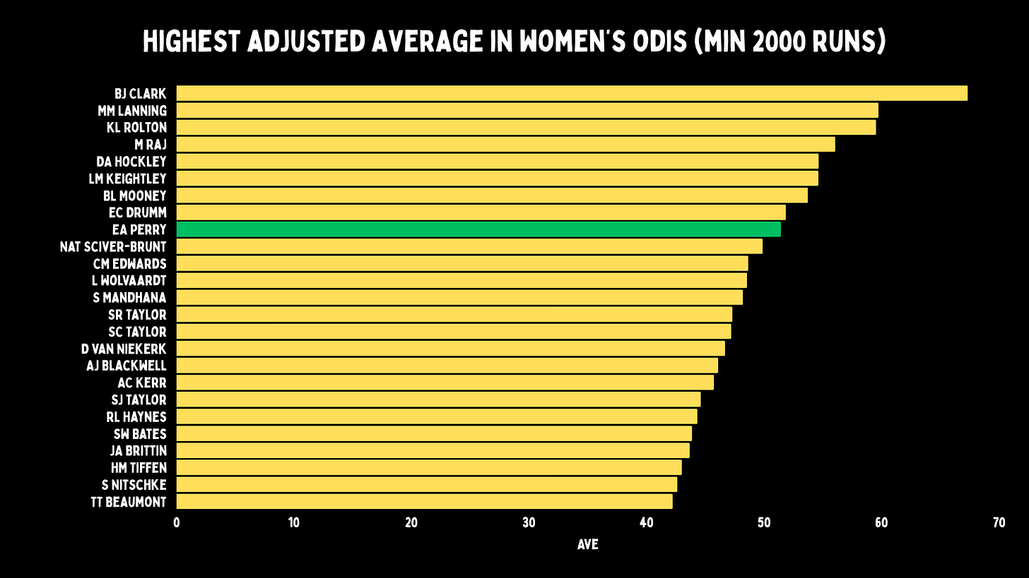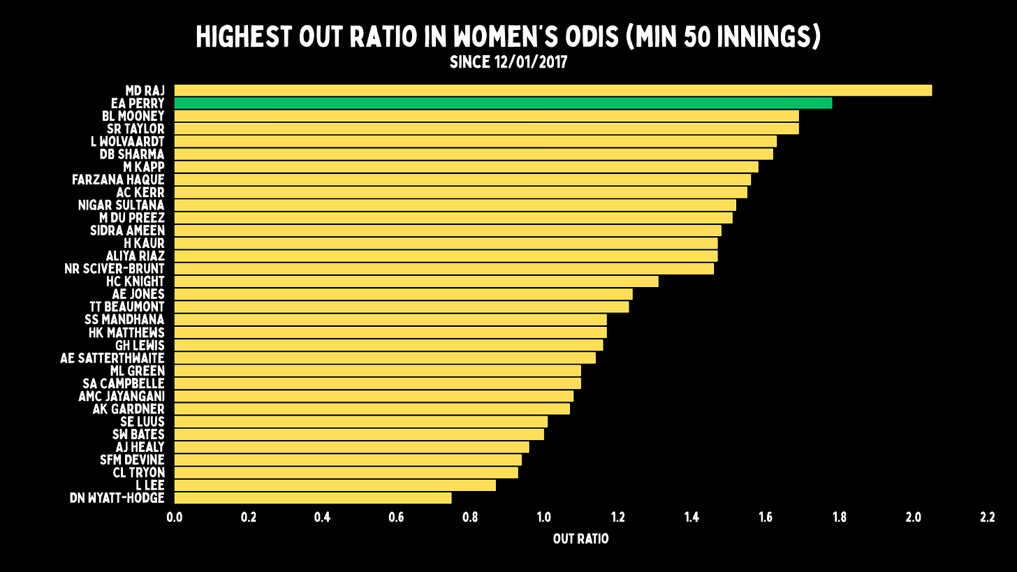 Perry’s batting career is built on a simple, stubborn principle: she does not get out. In Tests she’s not out in nearly a third of her innings; in ODIs it is very similar and she’s still elite at it in T20s. In ODIs, only Mithali Raj was better at surviving.