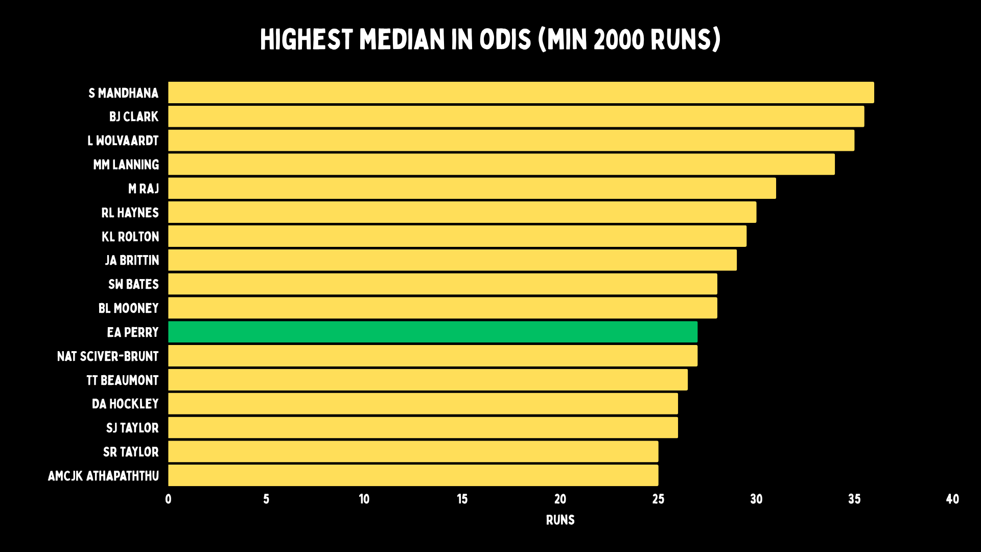 Number four suits her well - often starting against spin, not having to hit from ball one, long, slow innings that catch up because no one can dismiss her. In terms of Australia, Lanning hits harder, Mooney may be purer, but none match Perry’s consistency or refusal to exit.