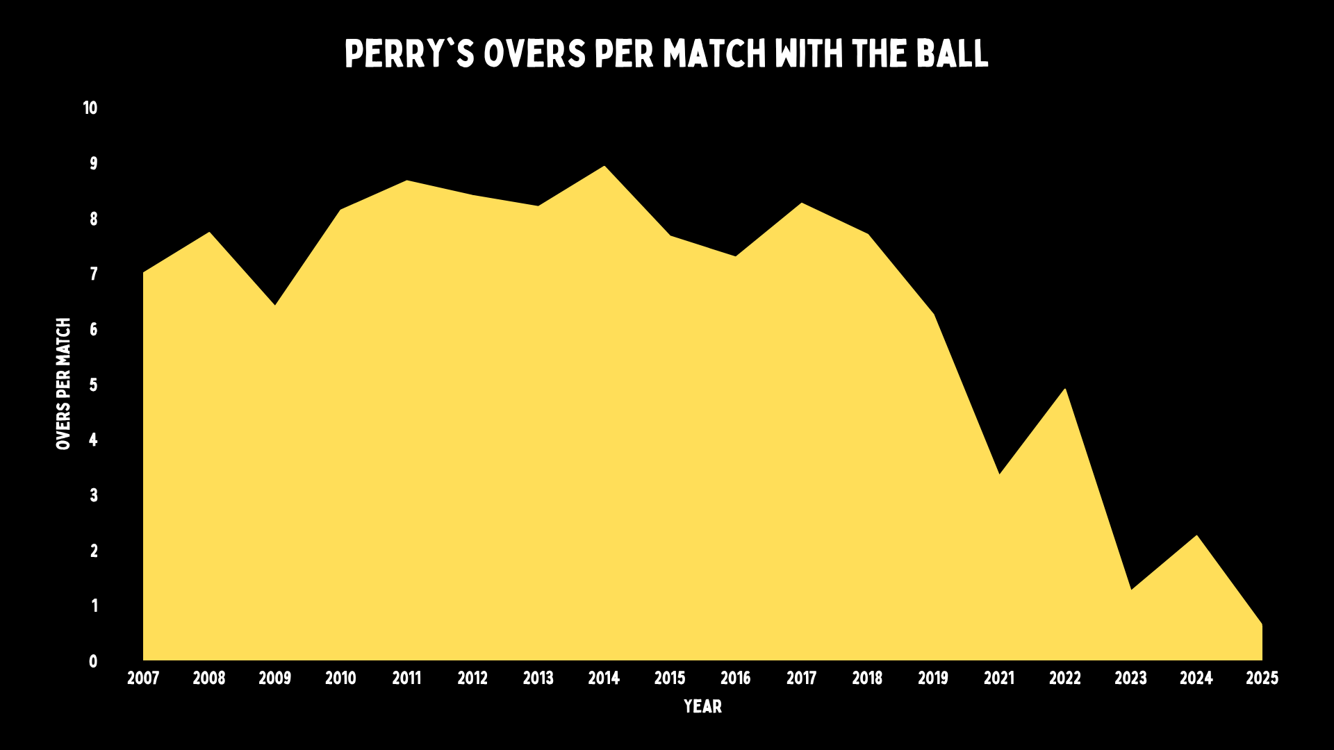 Ellyse Perry was a frontline bowler from her debut until 2019. For 12 years, she is a virtual lock to deliver her ten overs. Australia usually get teams out before then, but there is no doubt that’s her role. Since then, she has been either part-time or on break in case of emergency.