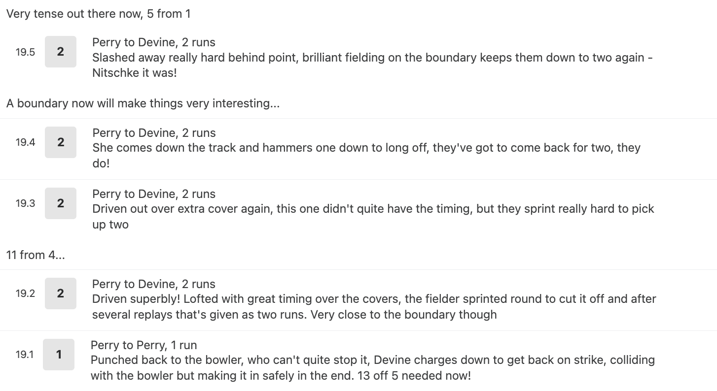 Perry’s over hasn’t been great; the fielders save her twice, and she allows Devine the strike early.