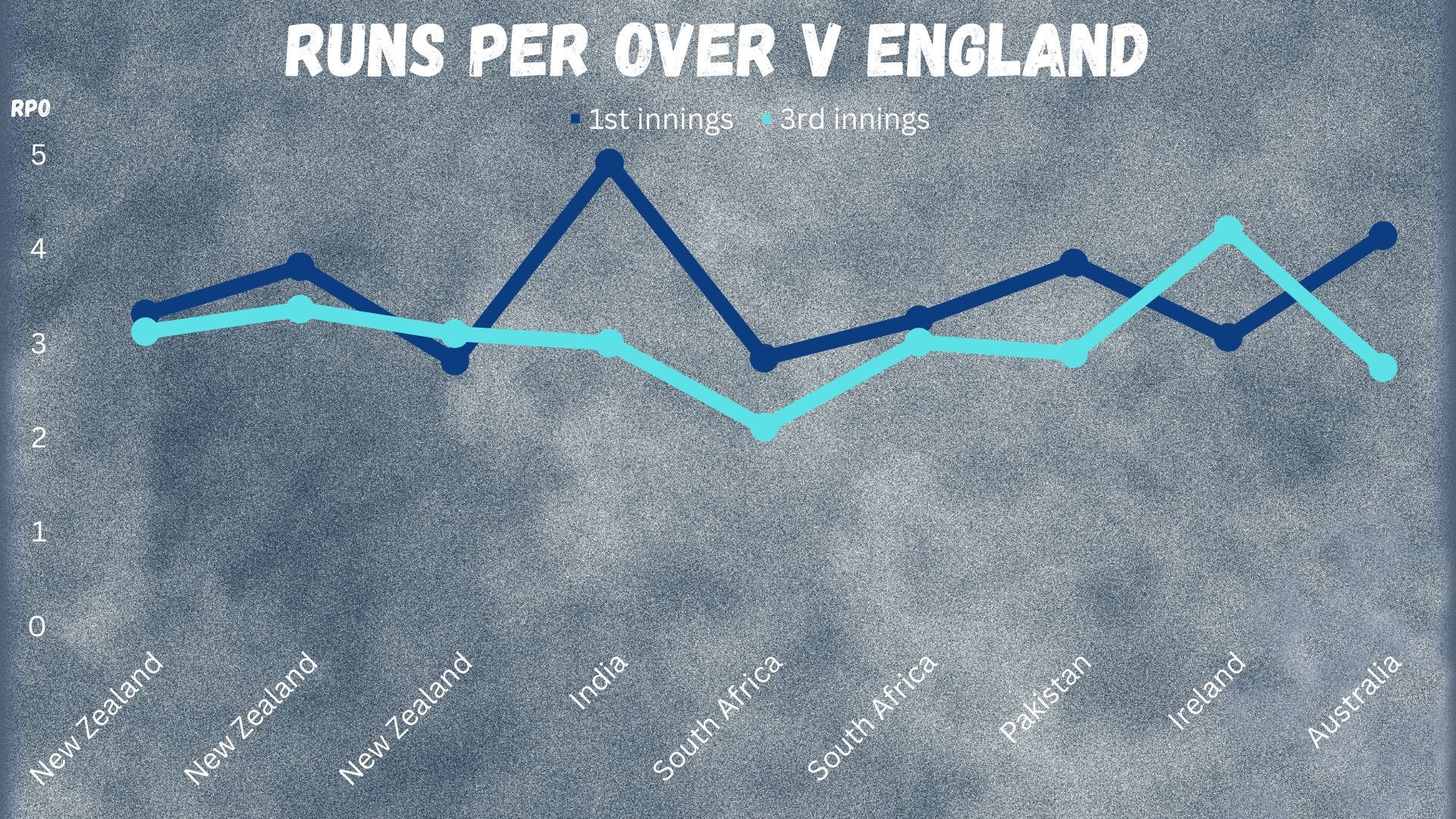 You take even a glimpse at this and you can tell what they have been doing. The only time a team scored way quicker against them in the third innings was when Ireland’s tail slogged a few to ensure England had to bat again. The only other occasion it was quicker was New Zealand in the third Test last summer, and then only slightly. England attack with the ball in the first innings and they defend in the second.