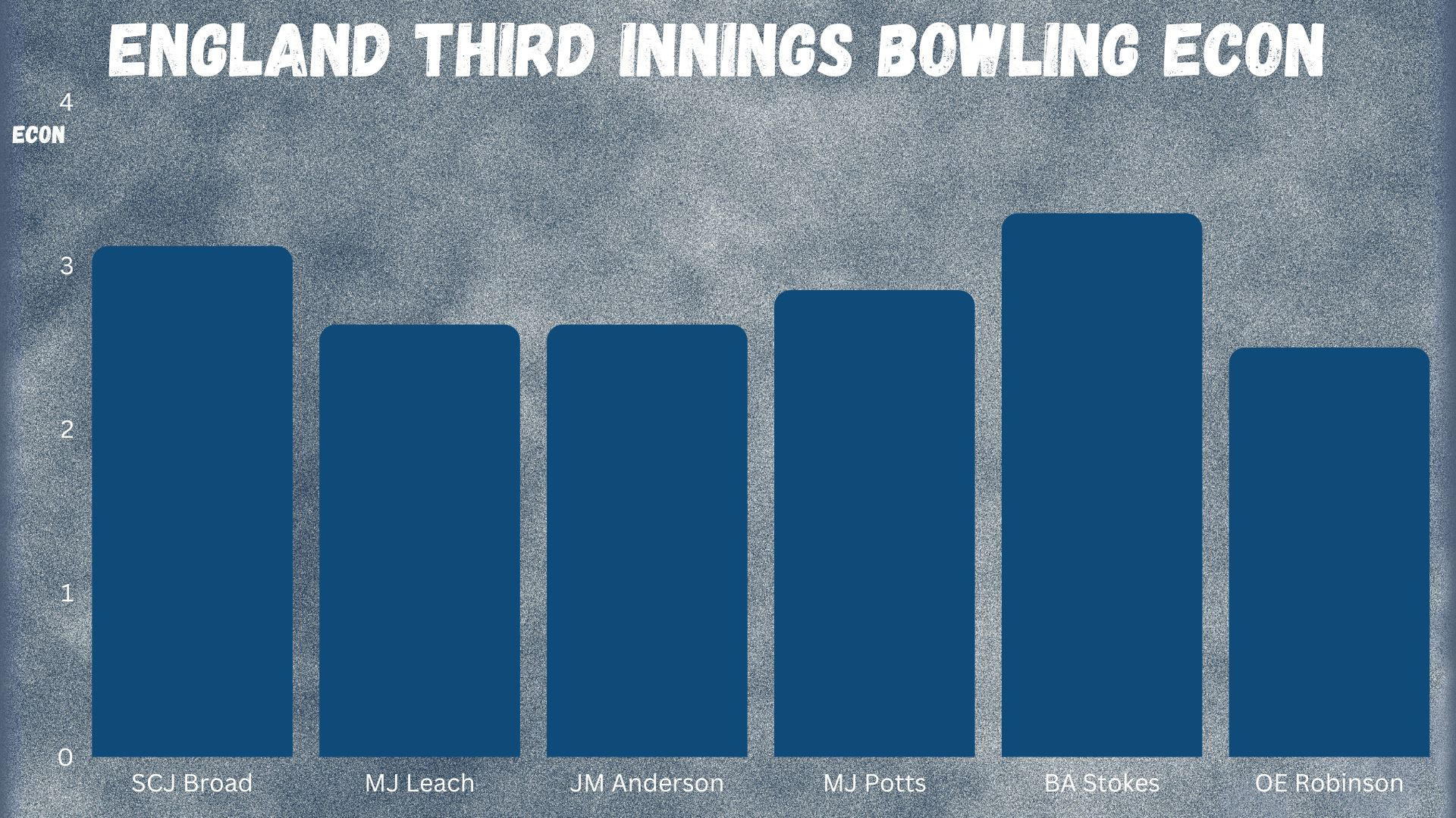 No one goes at more than 3.5 runs an over either. Stokes as the fifth bowler, and usually the one who tries the most is worse than the rest. But he’s also very good at getting set batters so that evens out. They have a plan, and they all stick to it, and when that doesn’t work they milk the last bits of cartilage out of Stokes’ knees.