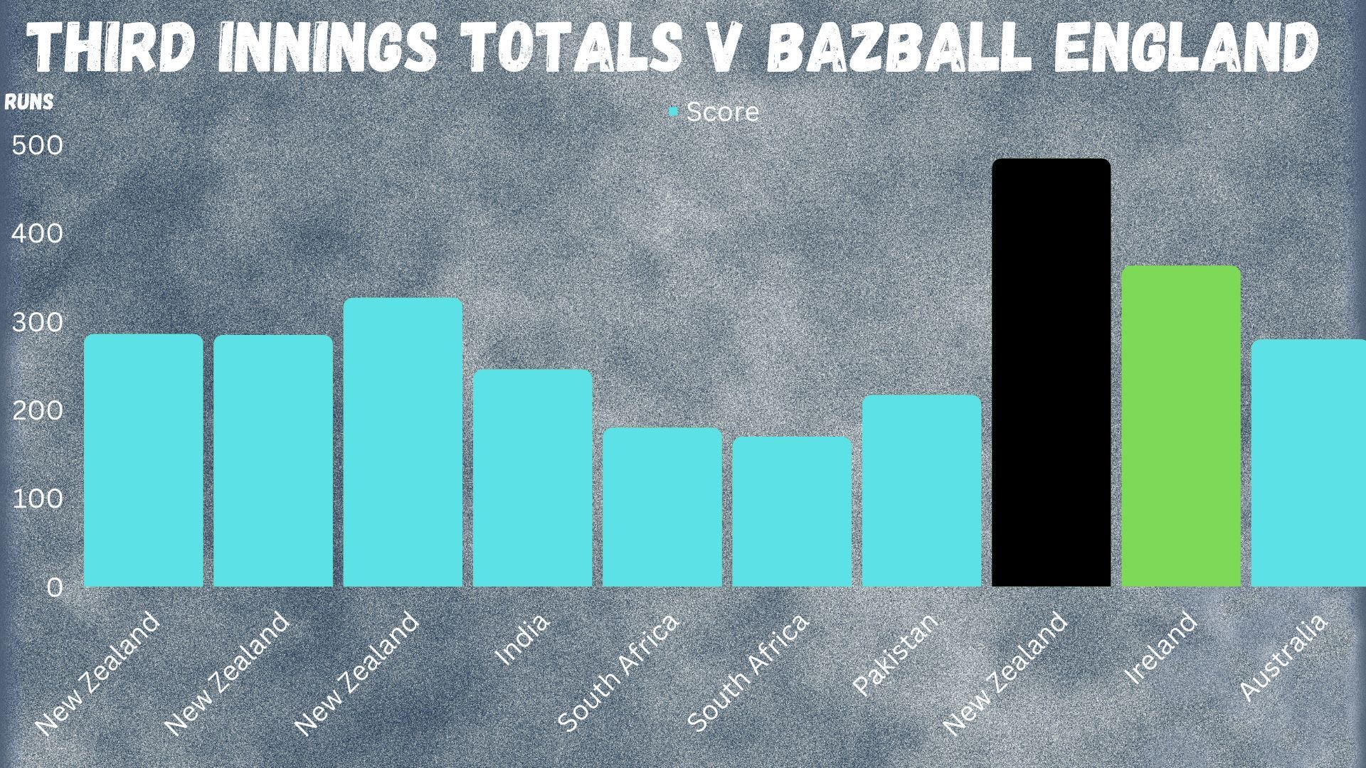 That is what England have done. They have made the third innings so boring that teams really try to simulate their innings rather than just going about their job. This is all the third innings against them so far. I have the other New Zealand third innings on here, but this was something very different because it was a follow-on. That may be why it was the first time a team did well against them. The other one is Ireland, who scored a reasonable total but the game was already dead then.