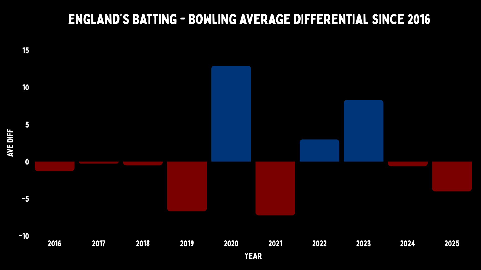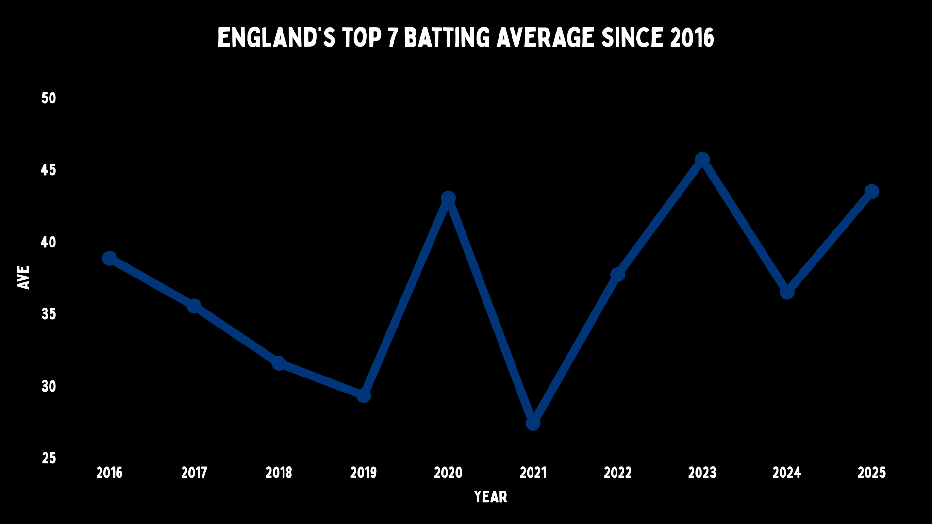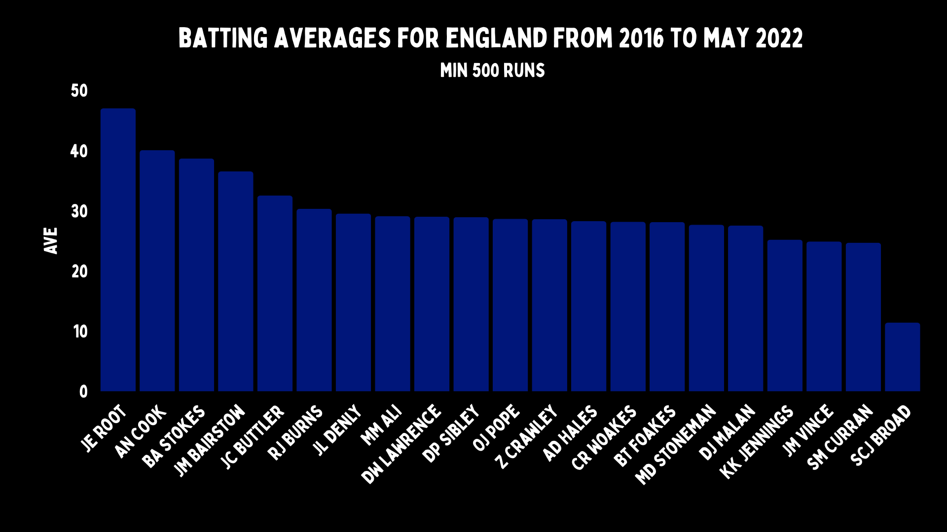 They had two batters with an average over 40 from the start of 2016 till the middle of 2022, and one of those was Alastair Cook, who retired early in this period. Stokes had the next best average of 39, so their fourth-best mark of a current player was Jos Buttler, with 32.15, some of which was him batting as a specialist number seven bat.