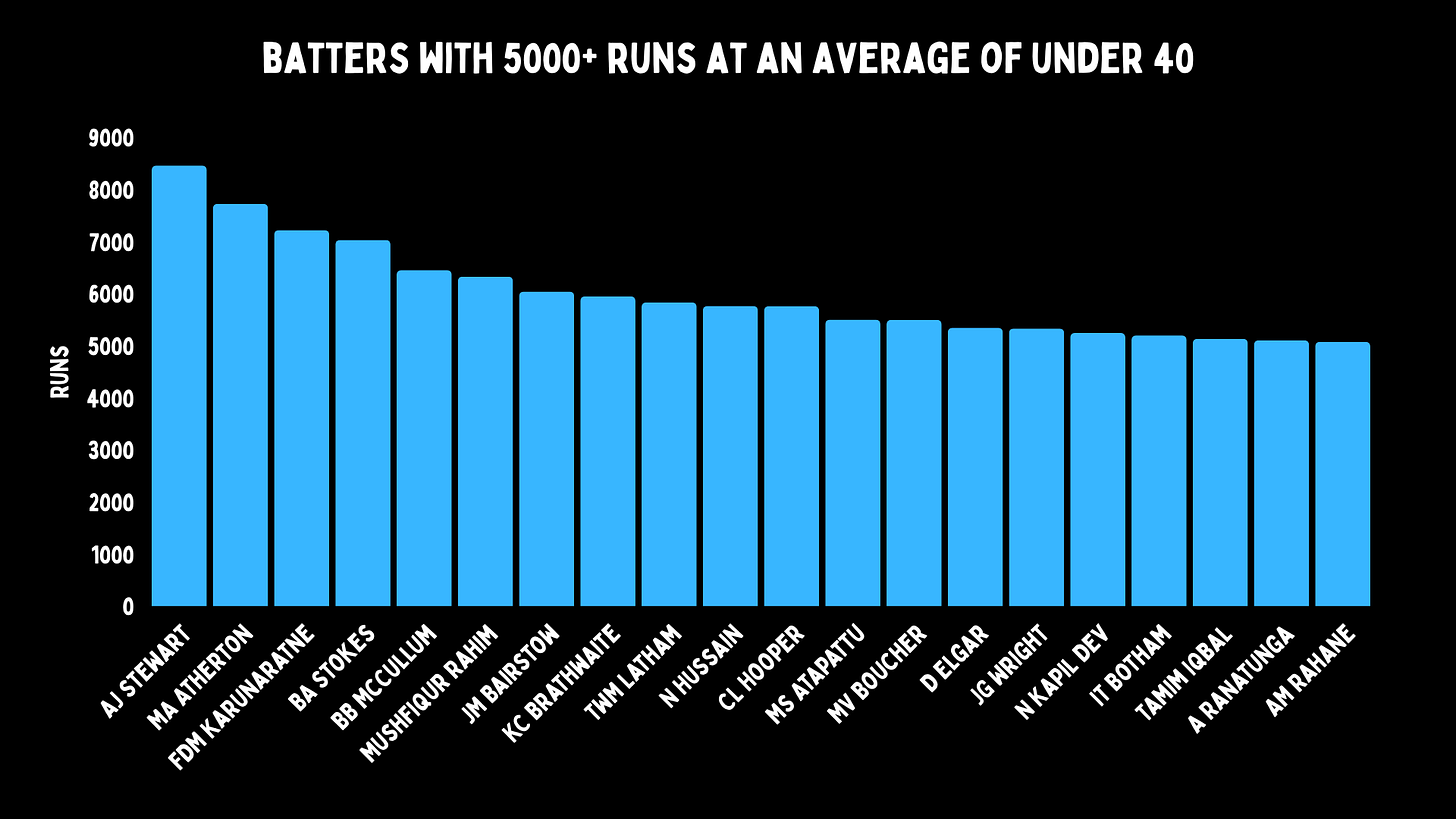 There are 20 batters with 5000 Test runs who average under 40. Alec Stewart is the only one who makes it to the 8000 club. His career is fascinating; he plays in a weak English side and keeps wickets for over 60% of the time. His career average drops below 40 only in his final few matches. He has solid numbers when batting in the top three, and that’s even when he was a wicketkeeper in some of those. The magic number for Stewart is that he goes at 35 when keeping, 47 when not.