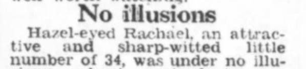She was living in a world where newspapers would describe her as “Hazel-eyed Rachael, an attractive and sharp-witted little number of 34”.