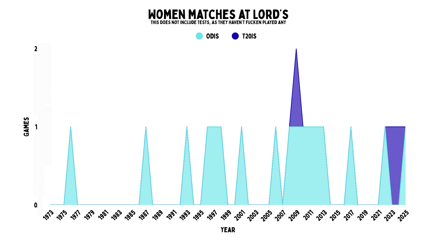 The MCC did host a Women’s ODI in 1976, and then straight after in 1987. From then on, they held them regularly, except when they’d forget them for years. Since they held the 2017 World Cup final, they’d managed to fit in two more.