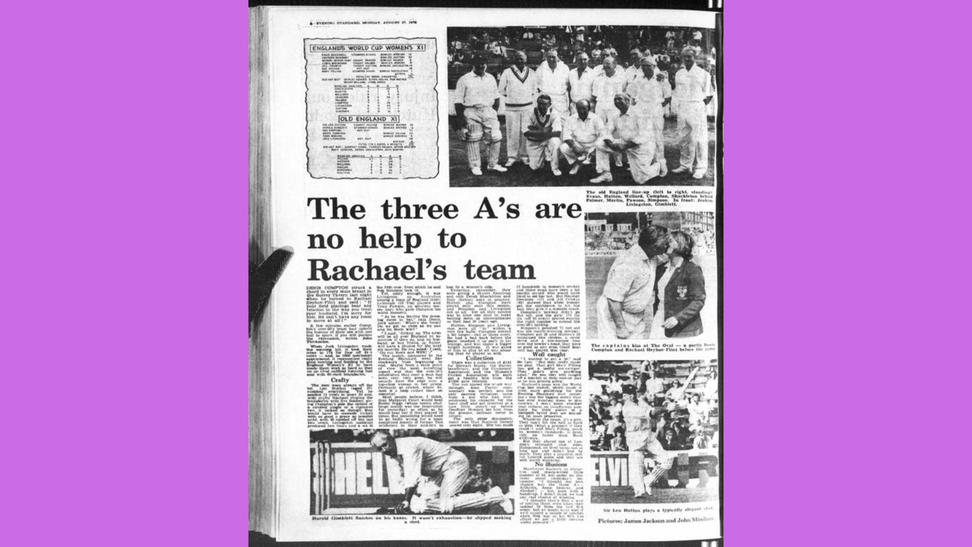 England women did play at the Oval that year, but not in the World Cup, instead it was against an old England XI. One of the promo photos is Denis Compton leaning in to suck the soul out of Heyhoe-Flint through her mouth. So when it was to watch a geriatric Len Hutton push through the covers, the England women got a big ground. To play in the World Cup, it was Ilford and Exmouth.