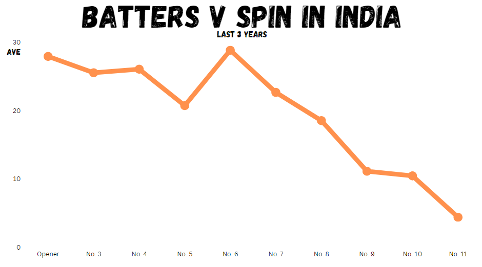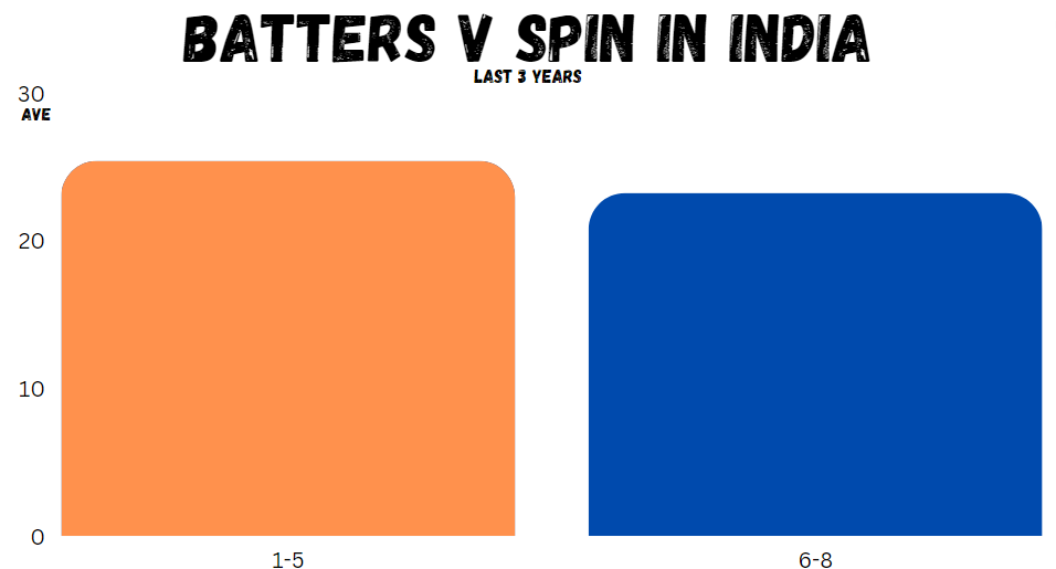 One last thing I should mention is the early wickets thing. The highest-scoring batting position versus spin in India right now is number six. In no normal circumstances should that be the case. Even number seven is doing better than the fives, and eights are not that far off them either.