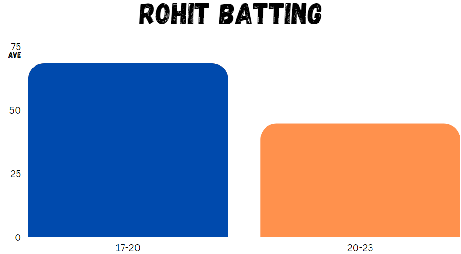 Then you get to Rohit Sharma. He is still averaging 40 in this current period, so he doesn't get much flack. But it's still a 24-run drop from before. He's still averaging 50+ as an opener, but it's not looking as dynamic as before.