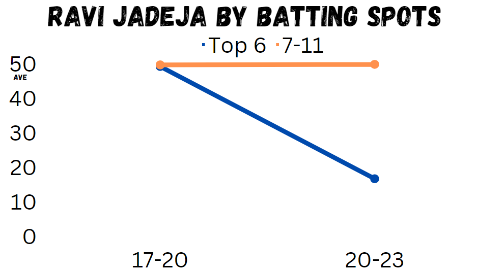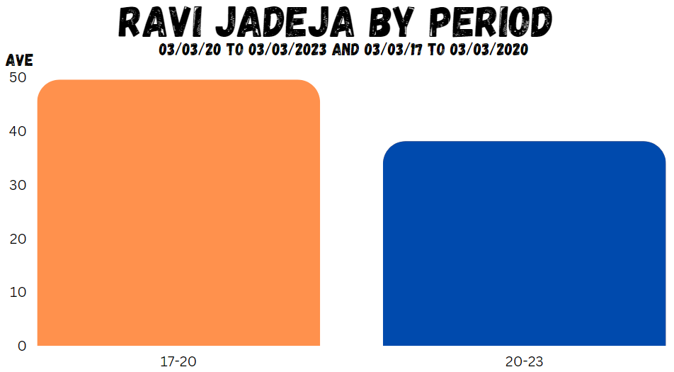 Now, Ravi Jadeja enters the conversation. He is the only player for India who has spent a lot of time up the order and down low in these two periods. But this is his overall batting average in each period. And it's pretty solid in both. Obviously better before, but nothing to really worry about.