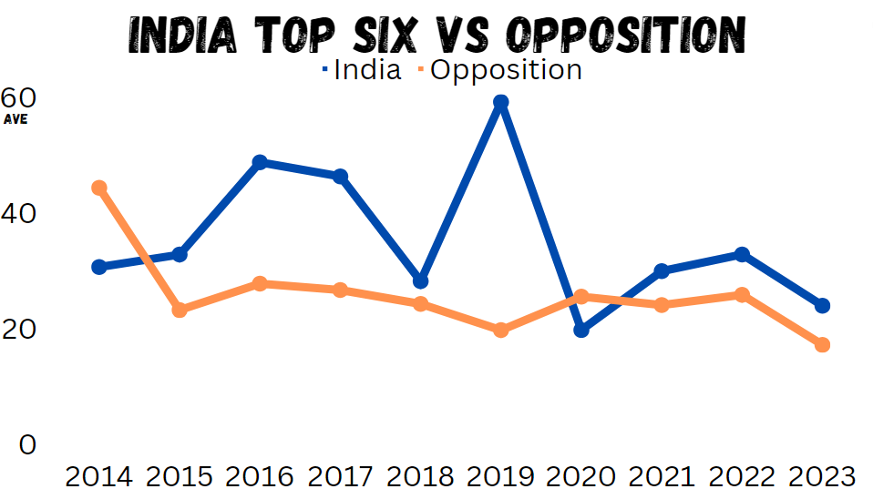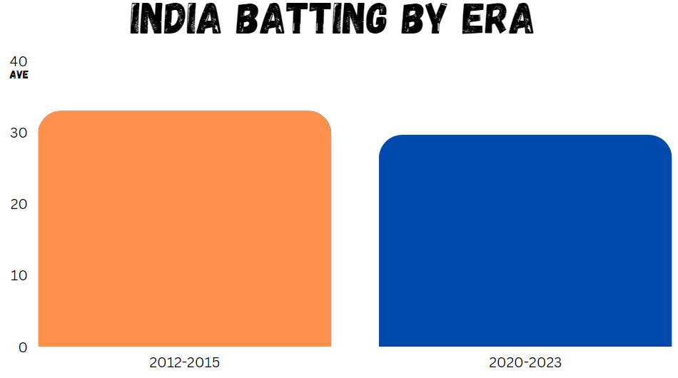 Worth noting that this is a number for all the top six combined. They actually have dropped 11.62 runs per batter. Meaning that in each innings, the top six are 69.72 runs worse off than they were before. So if they bat two innings, that means India is 130 runs worse in the last three years than in the three before.