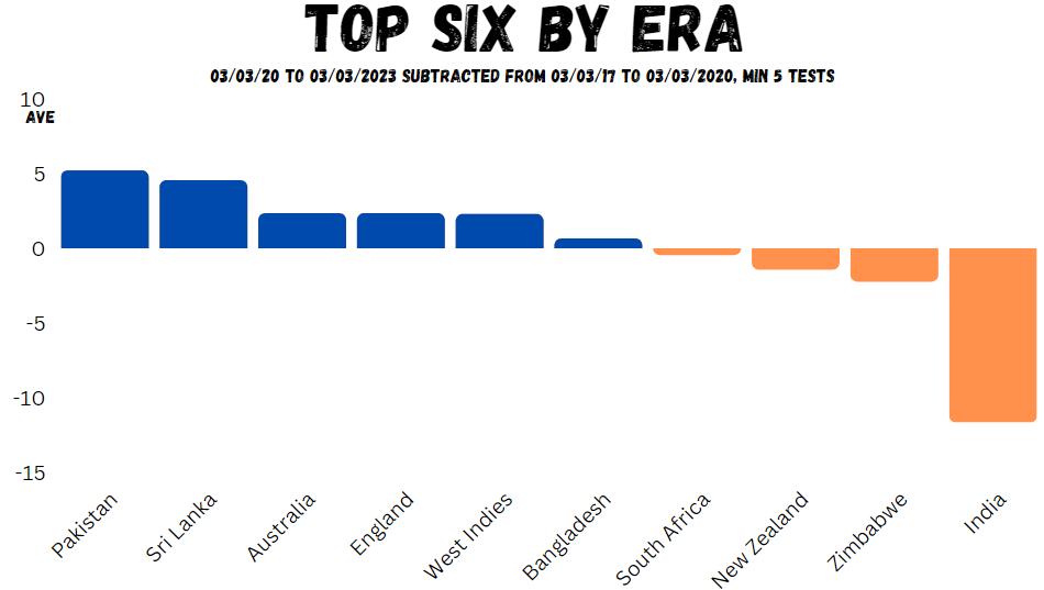 So what does that look like when you compare each era? Pakistan has a bump from playing a lot at home. Sri Lanka decided not to be awful anymore. Australia had good batting, but a whole host of players actually found form. England got a baseball bump. West Indies had a few players come in or find their best form. Bangladesh and South Africa are the same as before. New Zealand lost Taylor and Watling in this period and started to play away a little more as well. Zimbabwe didn't play much. And then you have the real outlier. The only team that has massively changed how they bat with their top six is India.