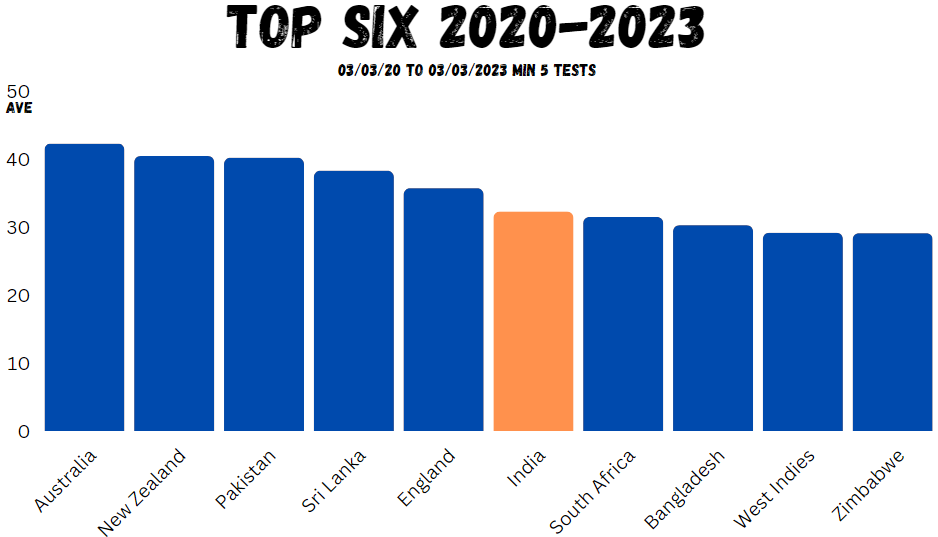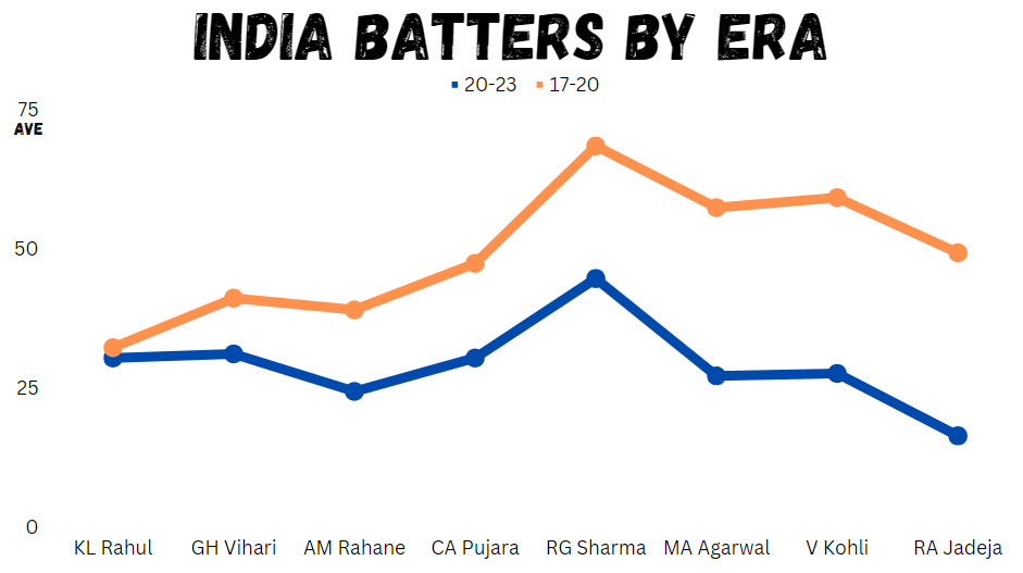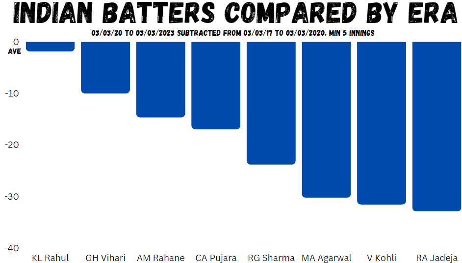 India has historically been a great place to bat, meaning their batters all have fantastic averages compared to other countries. Now it is not, and with the rest of the world struggling to bat as well. It means there is nowhere to hide for an Indian batter. No home, not away, not on social media.