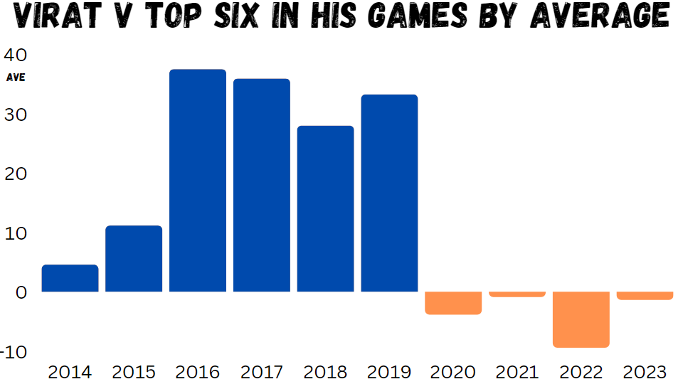 In 2020 he has a 36-run swing, from plus 33 to minus three runs compared to the other batters in his matches. And he stays negative from then 2020. Only 2022 is truly awful. But for the best batter in the world, being a minus is below par for him, especially for this long. If everyone is batting worse, fine, that should shrink his average, but he should still be outperforming others, and he isn't.