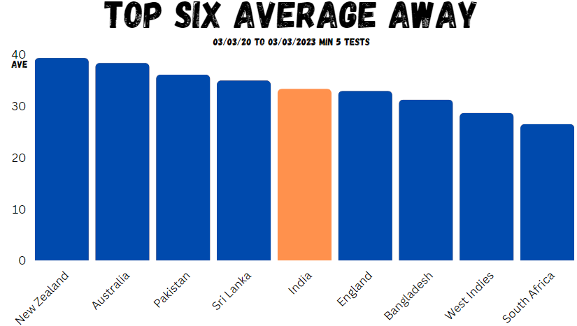 When you just look at the record away, it is not quite as impressive as this makes out. New Zealand has been the best batting team, and Australia are not far behind. Pakistan and Sri Lanka had fairly friendly schedules. But even so, India is only fifth.
