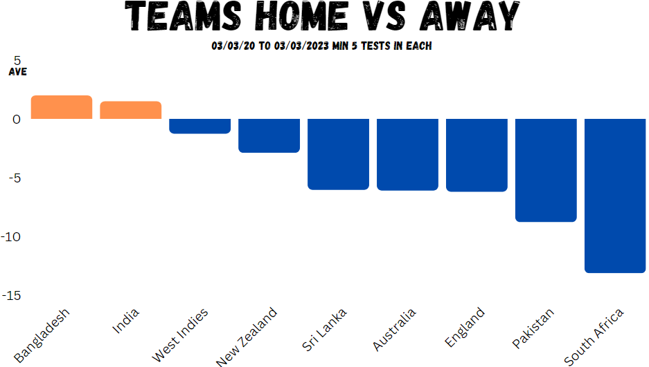 Now, we need to go a little deeper. Because this is where it gets fascinating. India are one of only two teams that average more away than home. Bangladesh - who I did not expect up here - is the other. Now it's only a small positive. But usually, most teams average less, so even being close to neutral is good. You see Sri Lanka, Australia and New Zealand in the normal range.