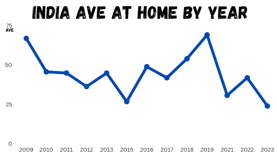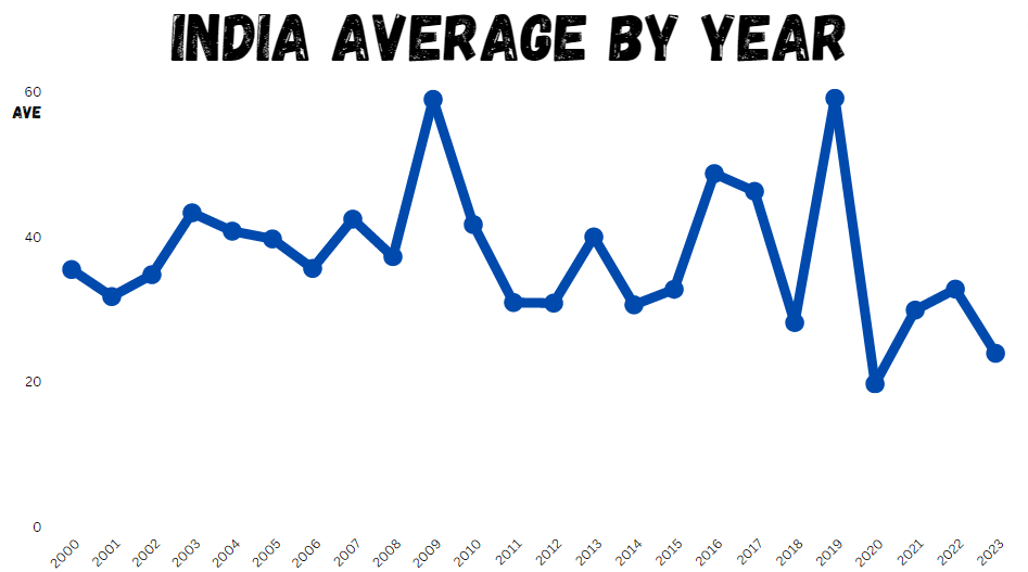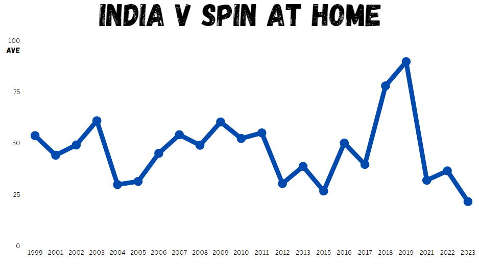 Here it is, this is India's average versus spin every year since 2000 that they have played at home. You can see that they only have one other period where they average anything near this low. And that was from 2012-2015.