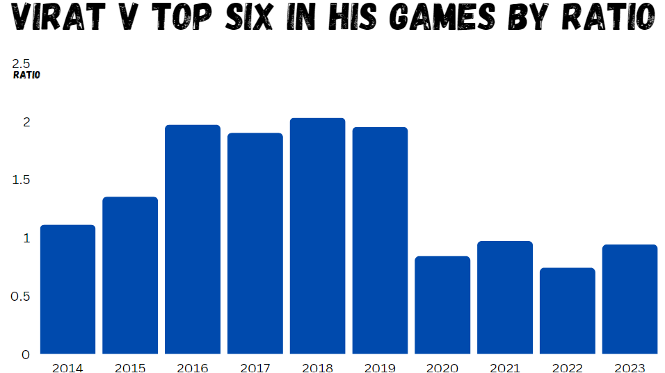 Just to show this all as clear as I can. This is Kohli's runs ratio in those games compared to the combined top six of each team. This is better than just average differential, as averaging 45 in 300-par score games might be more demanding than averaging 50 in a 350-par game. But there is no way to show it that doesn't have Kohli dropping off a map.
