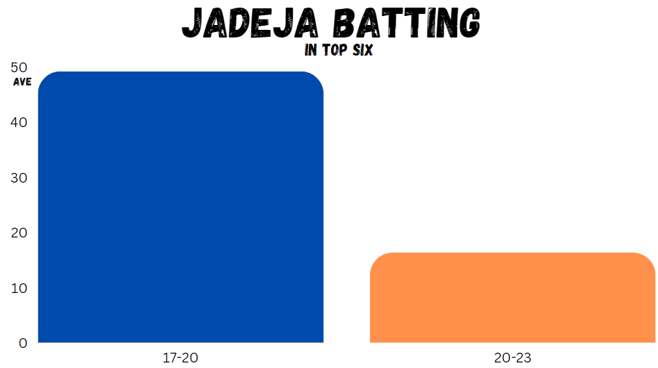 But let's get on to one that surprised me more. Ravi Jadeja. His is from the least amount of knocks, but everyone would consider him a batter now than in that previous period. But looking at this, it would be hard to make that argument. But remember this is him in the top six, he often batted at seven or low. And maybe this is the magic of small sample sizes, but this looks odd.