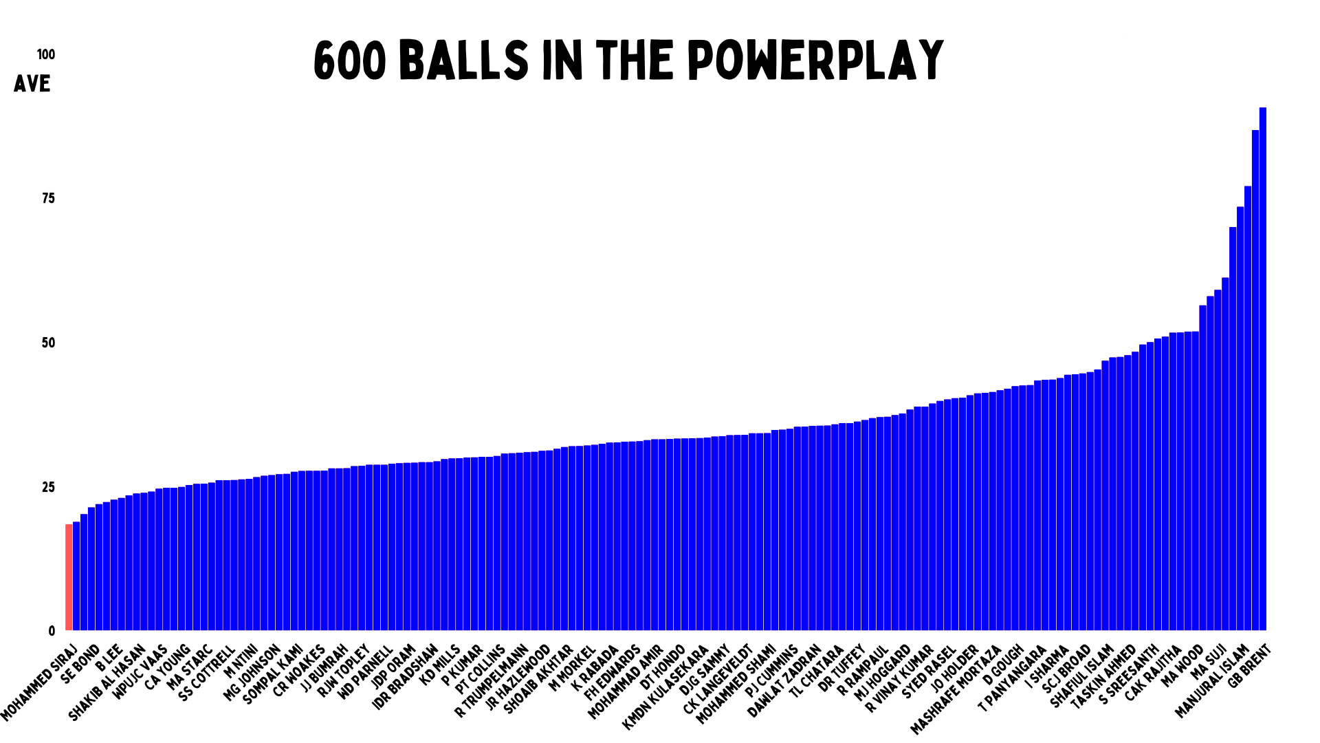 Mohammed Siraj averages 5.31 bowling to Sri Lanka in the powerplay. 16 wickets from 168 balls. But I wondered actually where he comes up in history. Of the bowlers with 600 balls up top, no one has ever had a better average than Siraj. Now obviously McGrath is just behind him, with four times as many deliveries in my database.