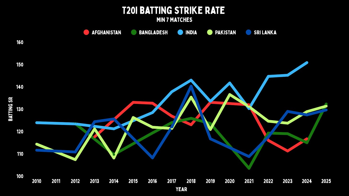 T20 is about batting, even when it isn’t. That is where I started, looking for the team with the most rocket fuel. I expected a slow and steady rise for most teams as cricketers hit harder. And I did not find that.