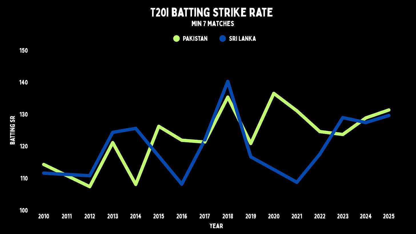 There were times when these teams were ahead of the curve. Sri Lanka were striking at 140 in 2018, and yet they haven’t gone above 130 in their last three years while other sides’ scoring rates have gone boom. Pakistan have been slightly quicker under Mike Hesson, but they’re not a fast-scoring team.