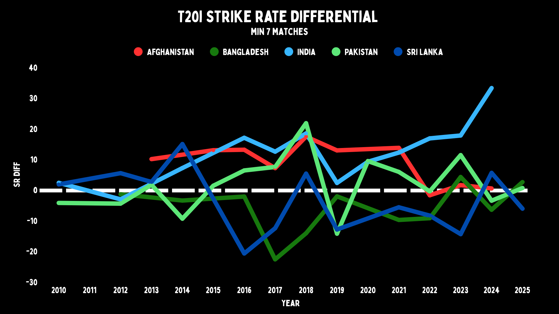 If you look at Pakistan and Sri Lanka, you see that there is a slight upward curve lately, but both have been quicker in the past. Pakistan have had years when they’ve scored quickly, and Sri Lanka aren’t that much faster now than they were a decade back.