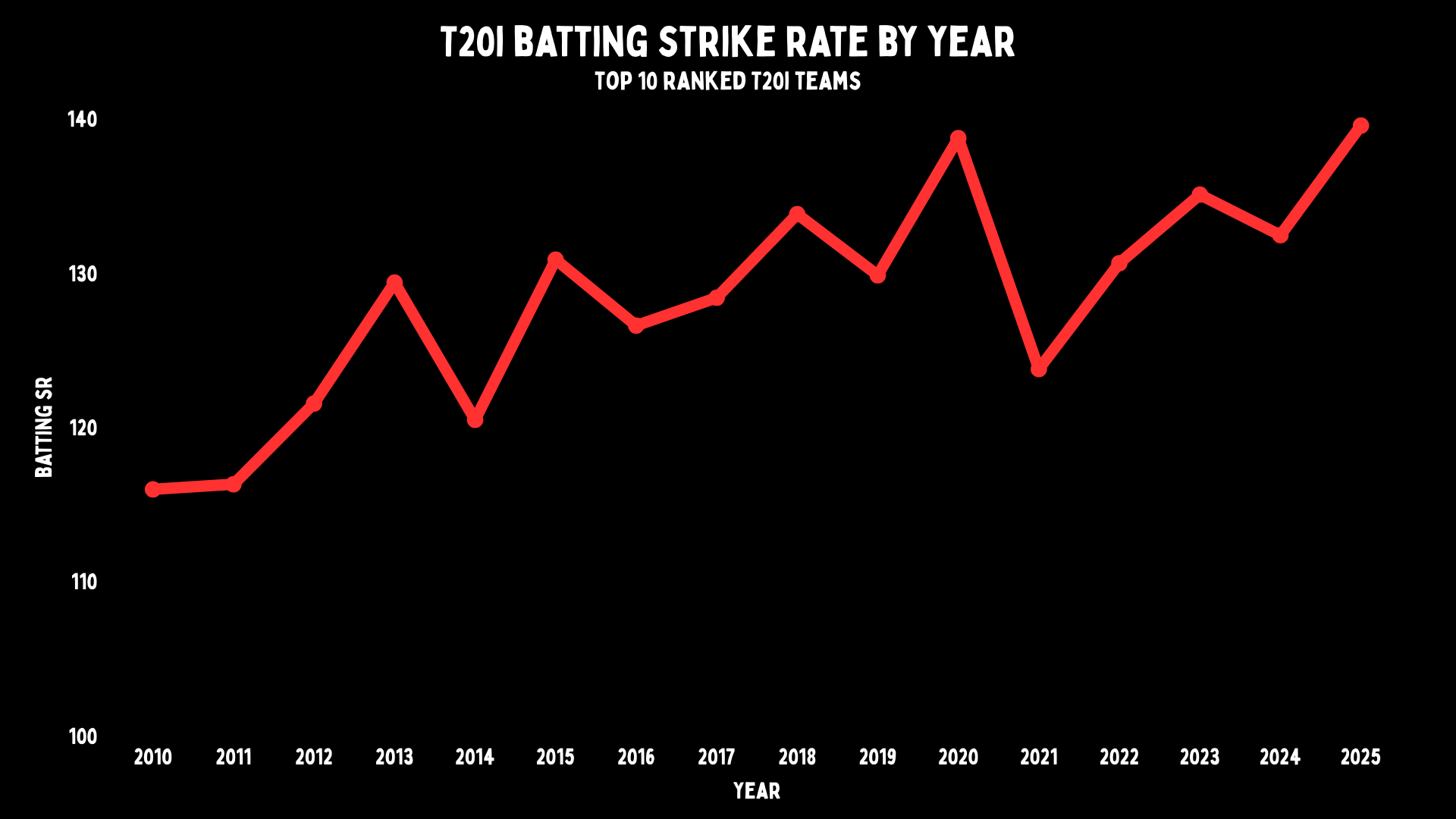 In 2010, if you look at the top ten-ranked T20I sides, the strike rate was 115. Four years later, it had risen to 120. This year, it is 139.