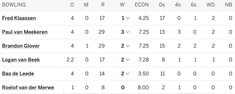 I have been talking up this seam bowling attack for years, but I wonder if this is one of the few major matches where it has really clicked as it should on paper. This tournament, the rest have been fine, but Paul Van Meekeren has been so far and away the best. He's still averaging under 20 and going at less than a run a ball this World Cup. Outside Bas de Leede's wicket tally, the others hacen't been quite at that level.