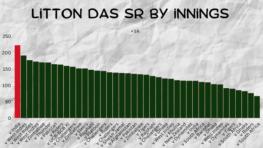This was Litton Das' greatest ever T20 innings. Now, I am not going to go through every knock for context or everything else. But Litton has never faced 25 balls in a T20 and had this strike rate.