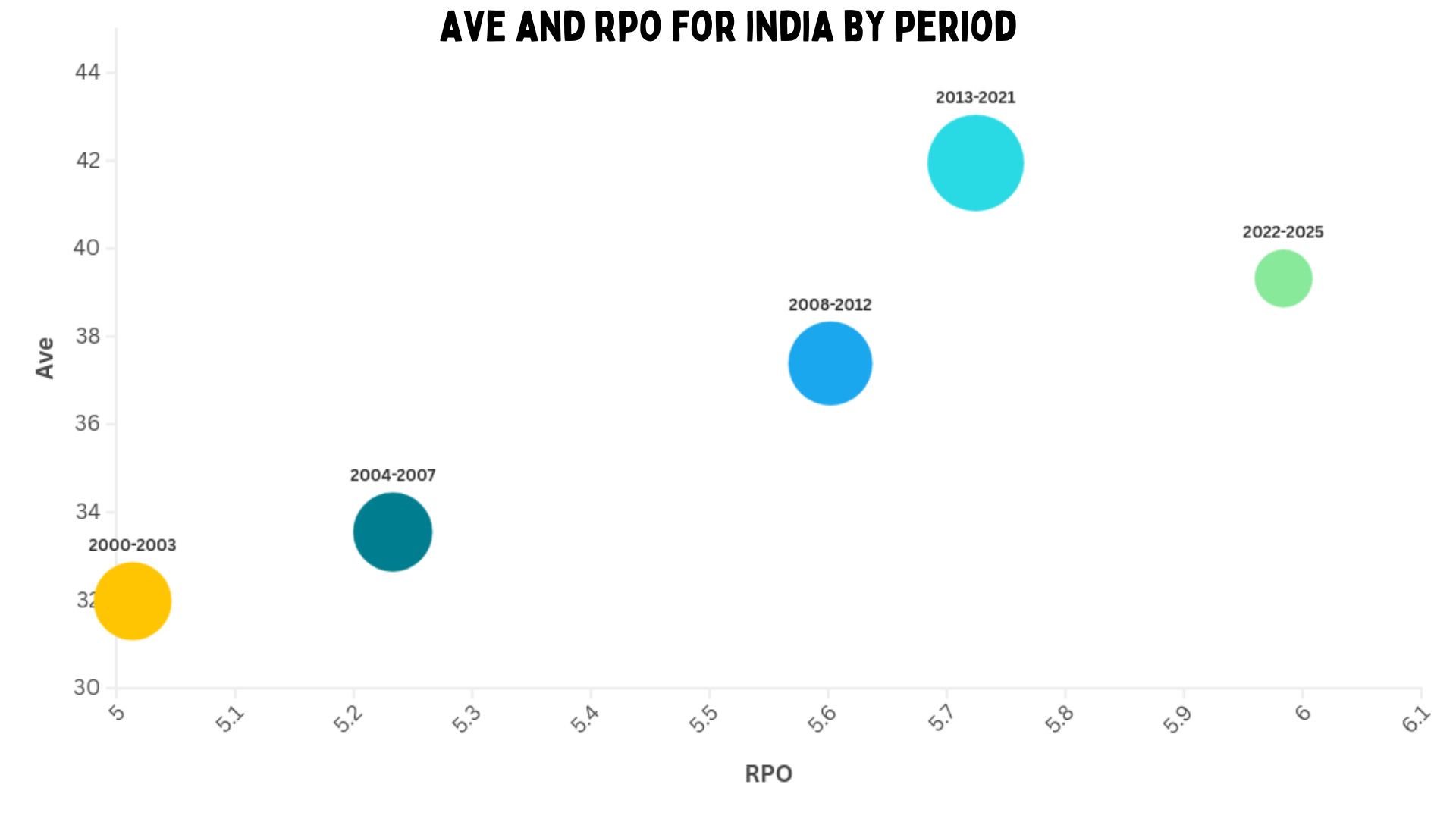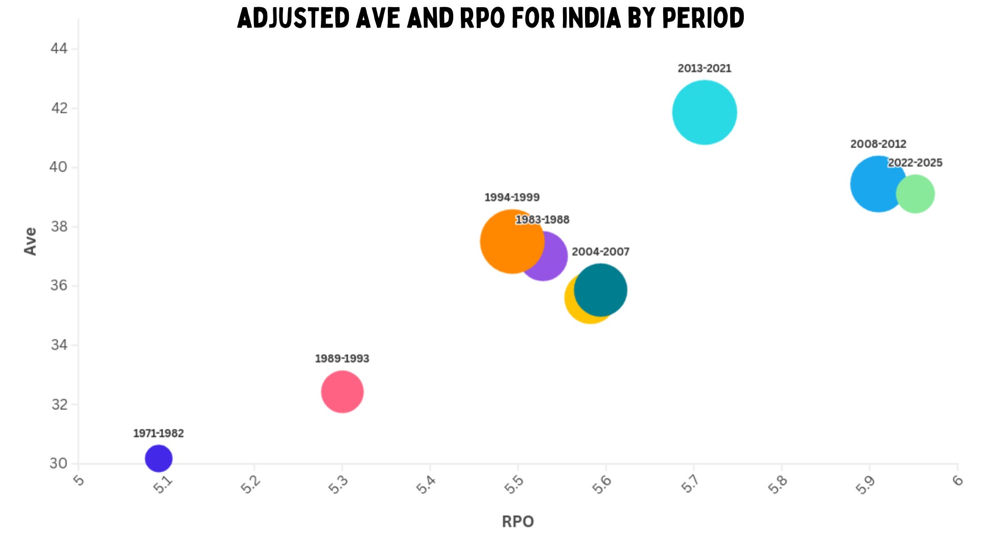 But I don’t just mean in terms of raw numbers. We use adjusted stats to work out how fast a team is compared to their era. And this is still the fastest-scoring team in Indian history. High-intent Rohit has really changed the kind of side this is, and having a bunch of all-rounders helps too. So they score fast now, even when they don’t.