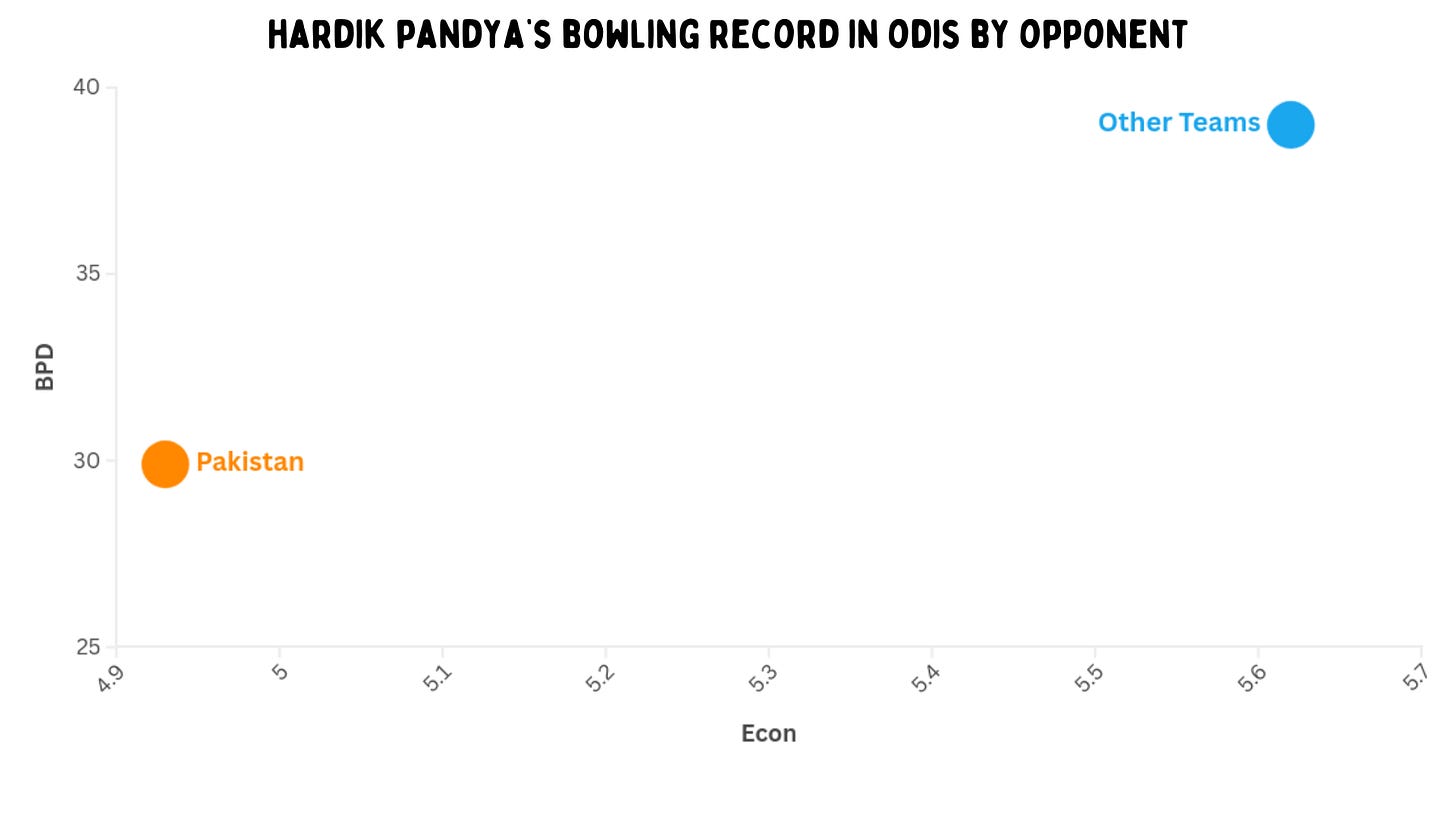 The allrounder has a stellar record against Pakistan with the ball (and bat, but that’s for another day). He has picked up 10 wickets in seven innings, while averaging less than 25 and taking a wicket about every five overs. That is the record of a frontliner. In this game, he got the wickets of Babar Azam - who looked in solid form before getting out - and Saud Shakeel, the top-scorer for Pakistan.