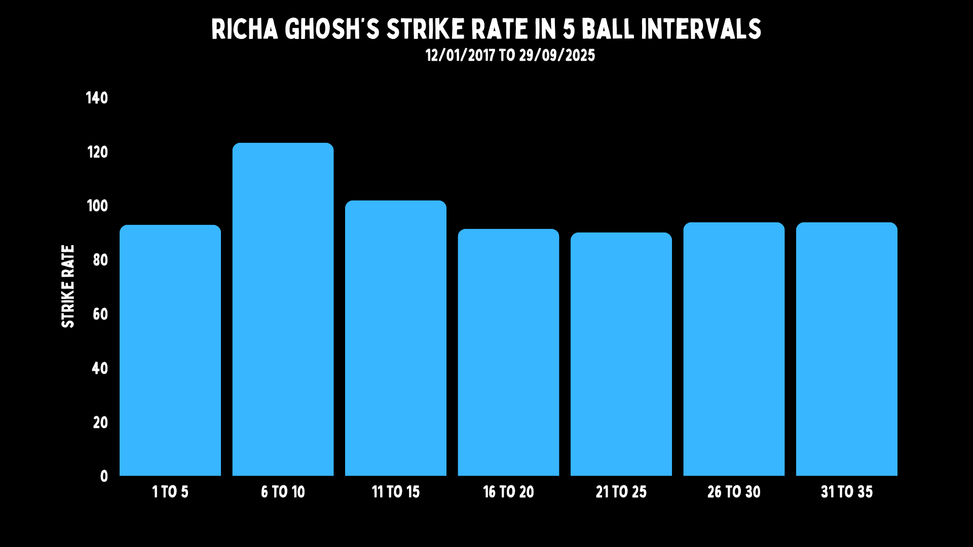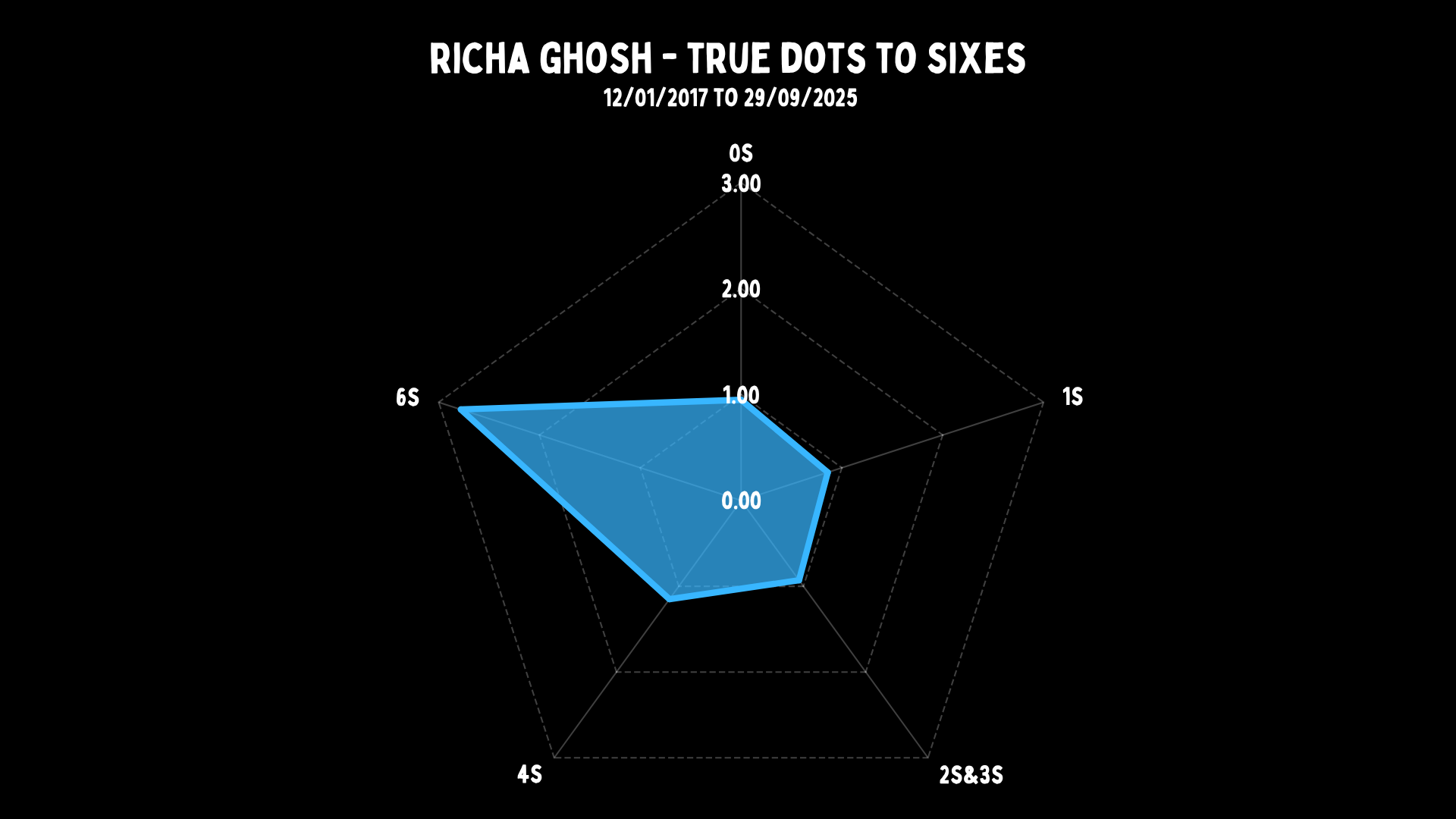 Richa Ghosh is not someone who should average 27. But there are reasons for that. One is her fast starts down the order, despite averaging 34 in the WPL. But another is Ghosh is all, or nothing. Dots or sixes.
