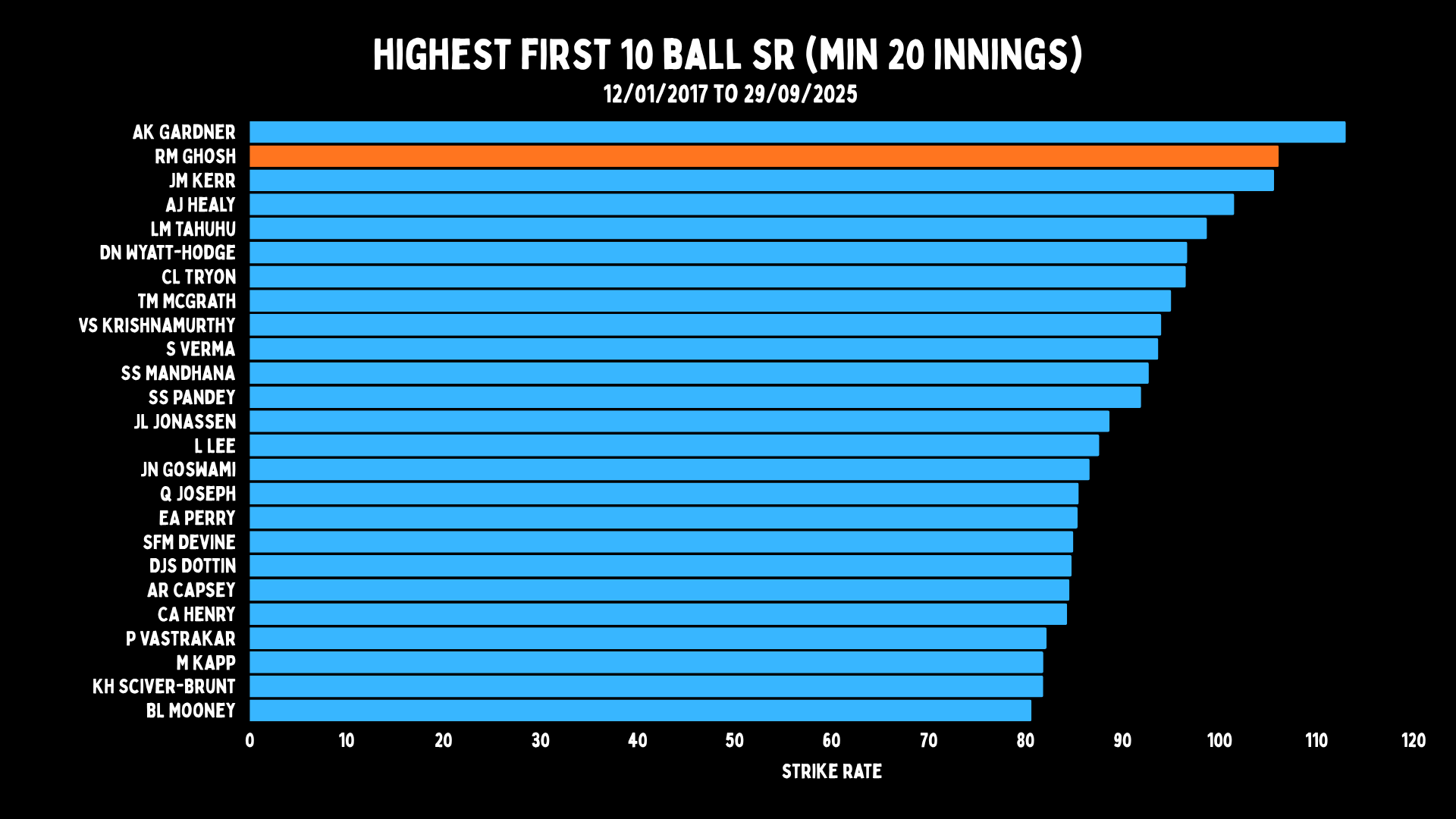 Richa Ghosh usually scores quick to begin her innings. Only Ash Gardner is better at it. Being at faster than a run a ball when starting a women’s ODI knock is quite a statement. But both of these players have a reason for that, they are there to hit, and way too talented to be where they are batting.