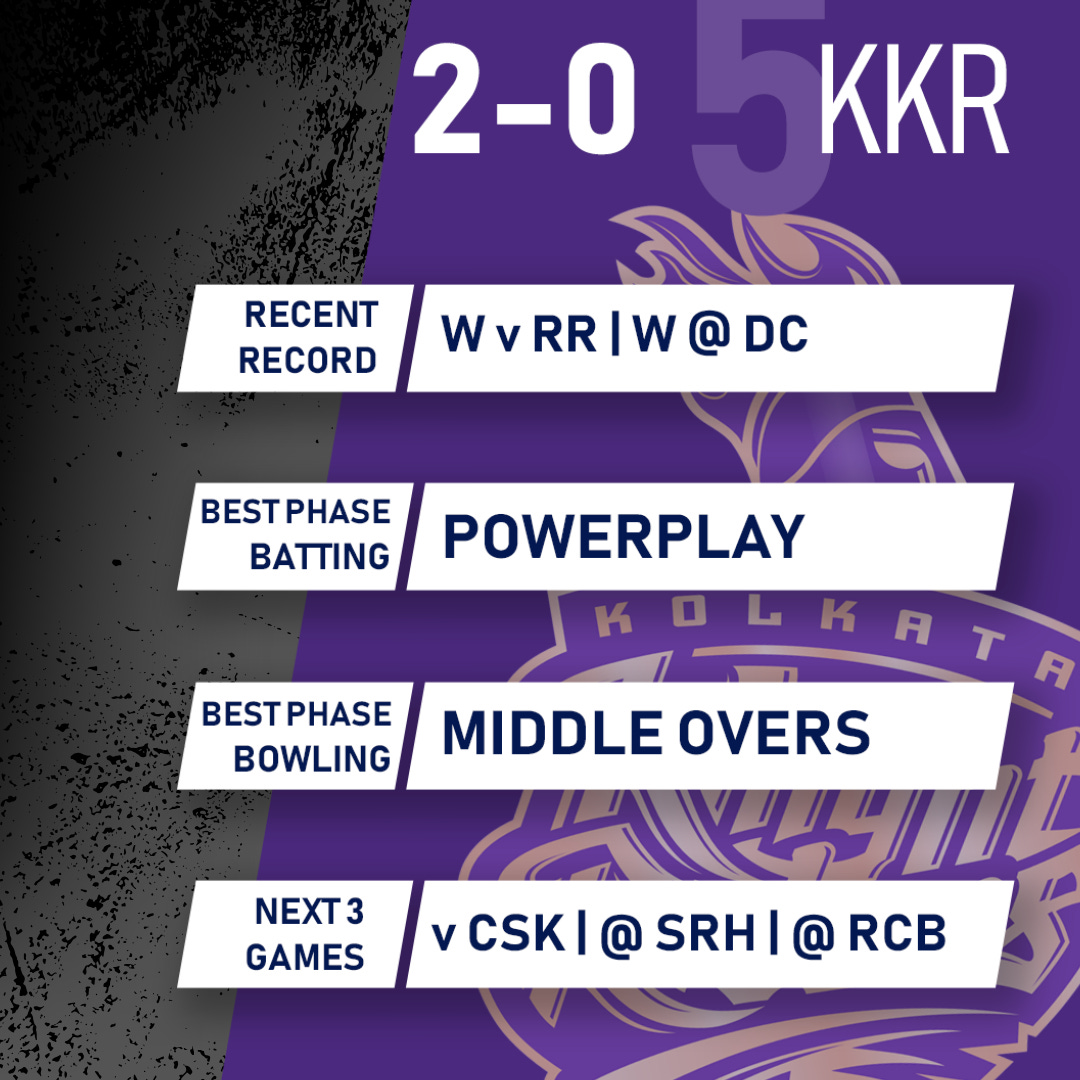 Ajinkya Rahane has been terrific in the powerplay, scoring 194 runs at a strike rate of 185. He has only been dismissed once. Sunil Narine averages almost 30 at a strike rate of 161, and Angkrish Raghuvanshi has made 72 off 40 balls without being dismissed. But Quinton de Kock struggled, averaging 13 at a strike rate of 118. He has been replaced by Rahmanullah Gurbaz, who has made 52 off 38 balls and has gotten out twice in the powerplay in four innings.