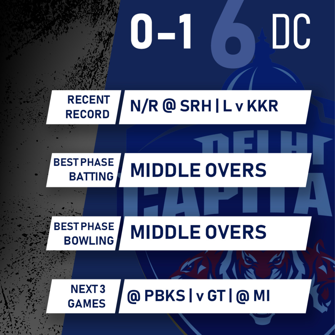 KL Rahul has faced the most deliveries for Delhi in the middle overs, scoring 246 runs at 49/144. Axar Patel has the best strike rate (157) of all DC batters with at least 50 deliveries in this period. Tristan Stubbs is the other batter who has faced over 100 deliveries, averaging 39 at a strike rate of 131.
