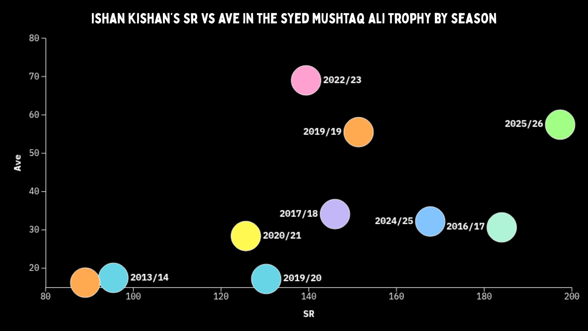 But Kishan’s first two seasons in the SMAT were pretty ordinary. He struggled to average 20, or score at a run a ball. Even in under-19 ODIs, he only made 186 runs in 12 innings at a strike rate of just over 80.