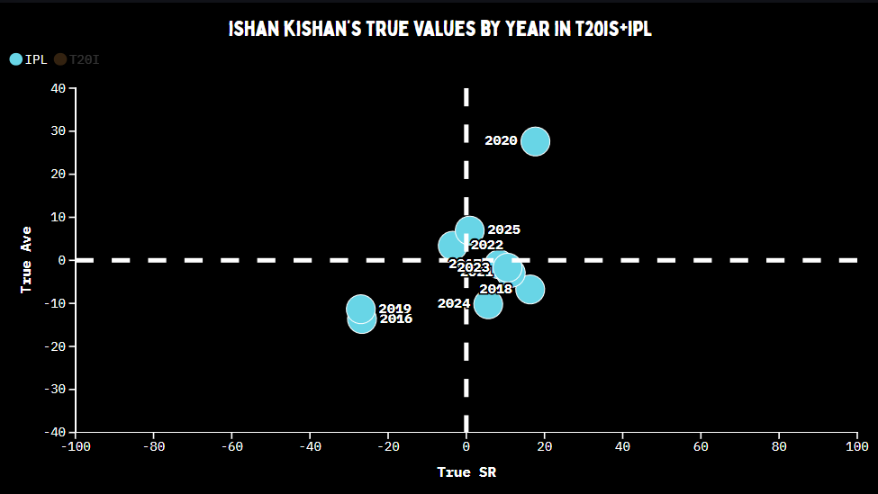 Kishan’s advanced numbers in the last two seasons of the IPL aren’t great either. In 2024, he had a true strike rate of 6 but at a -10 true average. He would swing hard, but miss often.