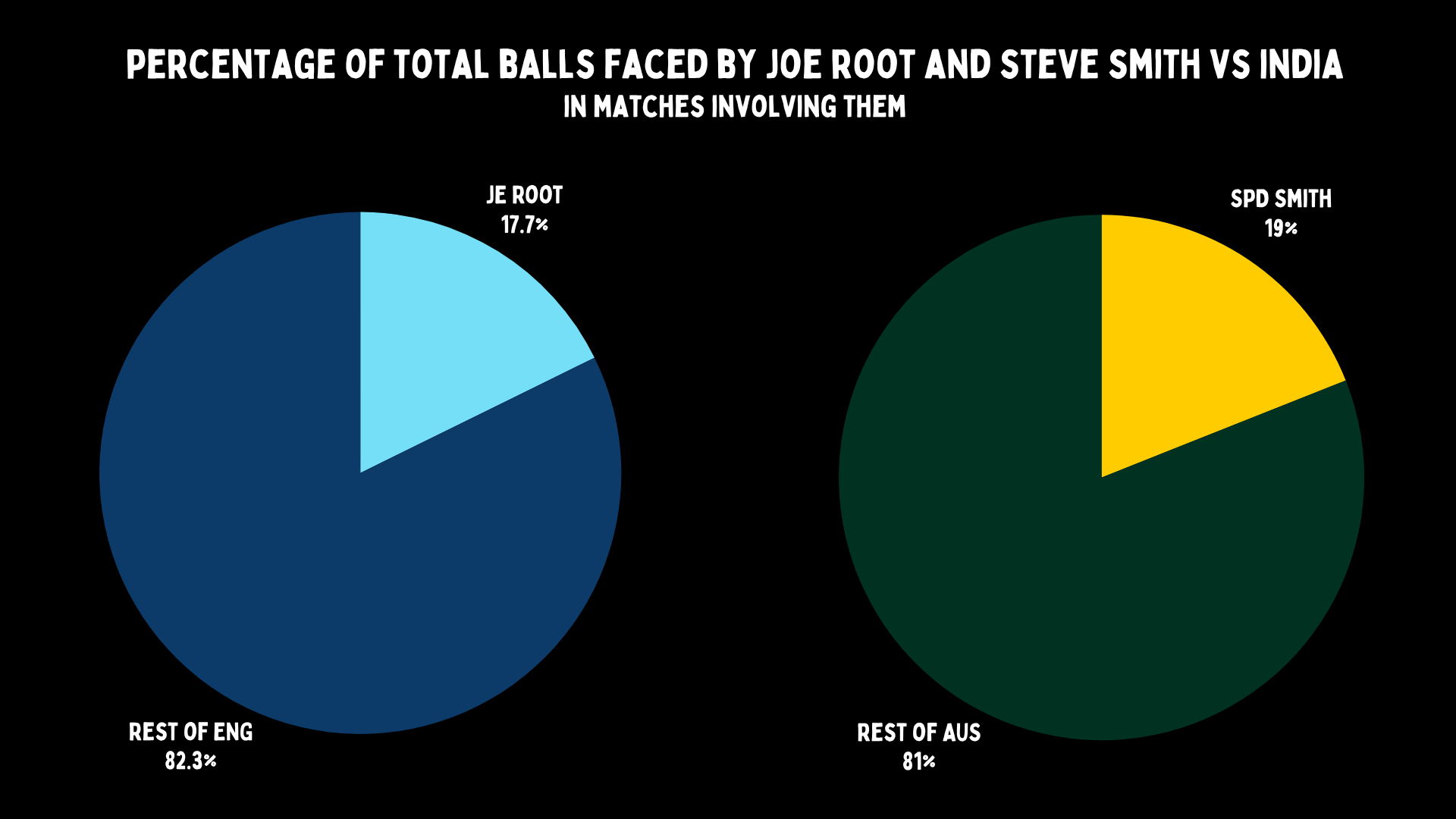 India have bowled 17.7% of their deliveries against England to Root when he’s played. That number goes up to nearly 19% when it comes to Smith. So if you tune in to a random over, chances are you’ll see Root or Smith face at least one ball.