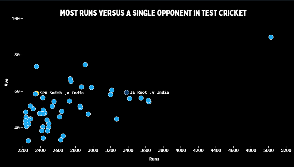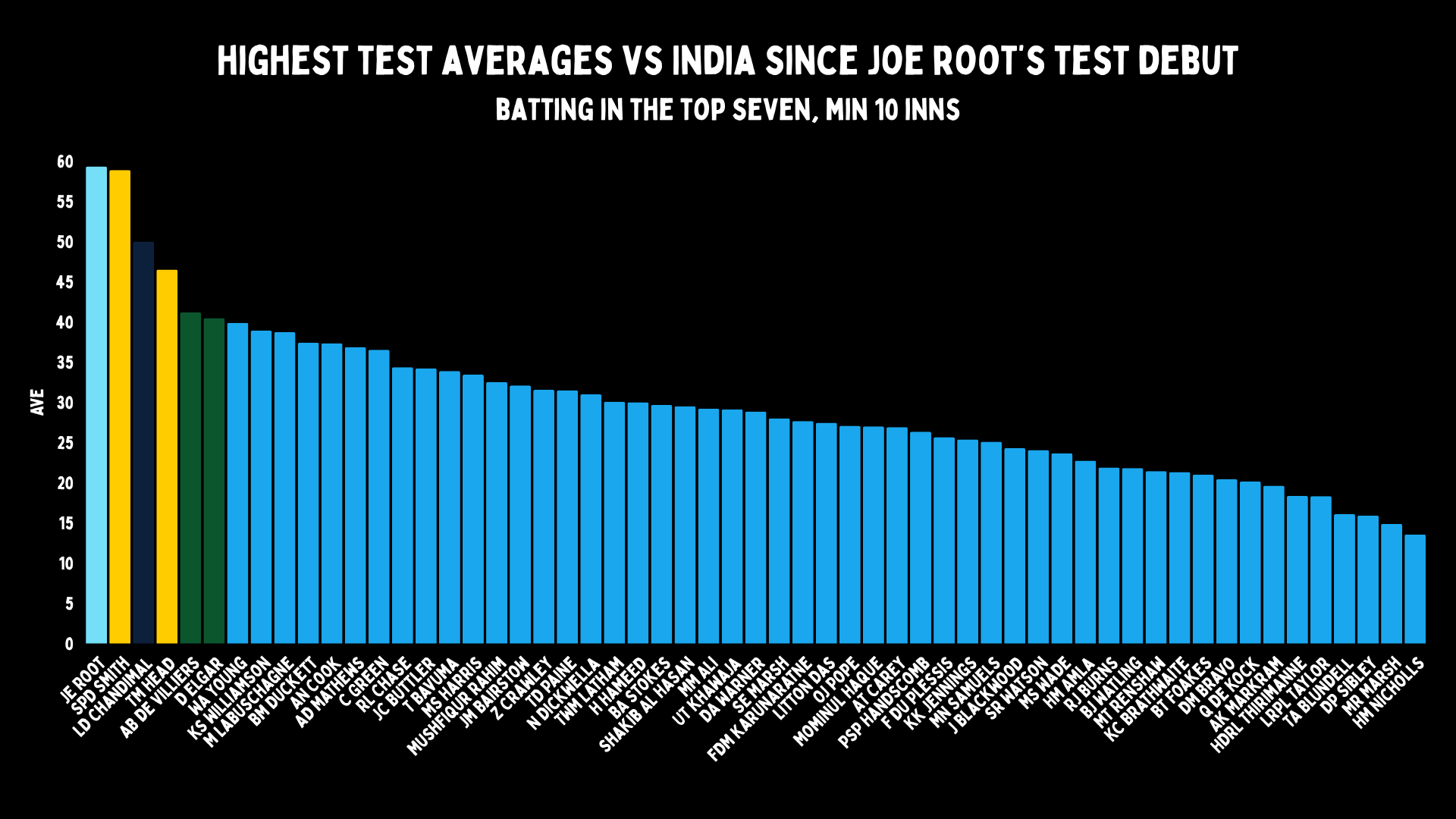Unlike Smith and Root, the other four haven’t done it over a long period of time. They’re cameos. The main players are clearly going to come from long careers within the Big Three. And Head debuted quite a few years later. So these two have over 5700 runs against India, which is about a thousand more than the next four batters combined.