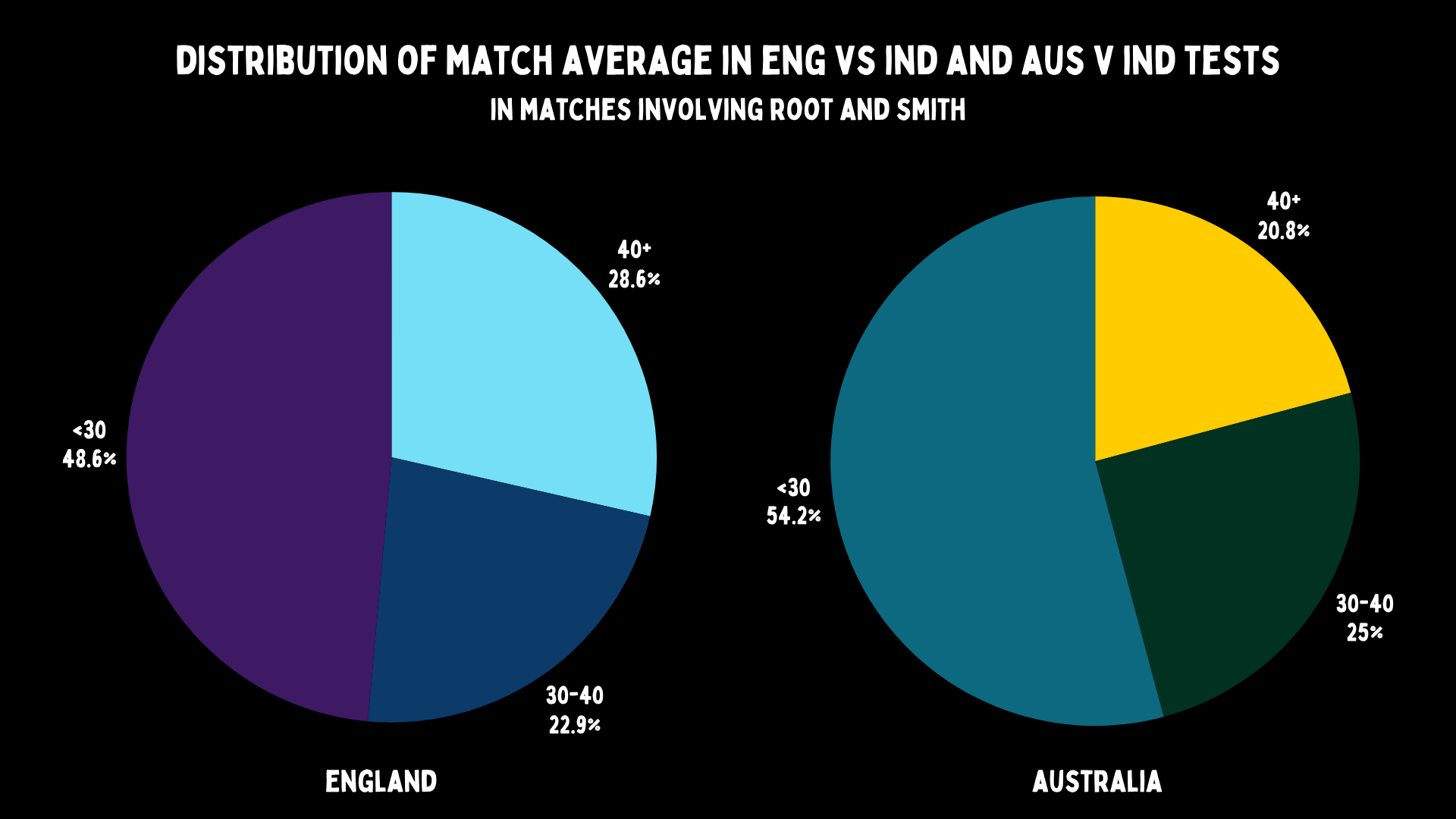 Joe Root has the better average, but Steve Smith’s match factor is higher. It implies that the other top-order batters have averaged less in Smith’s matches. If we assume a match average of over 40 as high-scoring, Root has appeared in 10 such games out of 35, while Smith is at 5 out of 24.