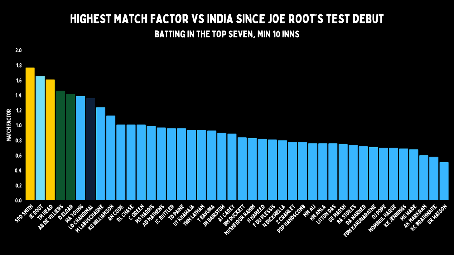 On match factor, Head stands out even more, while de Villiers and Elgar also overtake Chandimal. But it’s mostly been these six batters who have enraged Indian fans and bowlers.