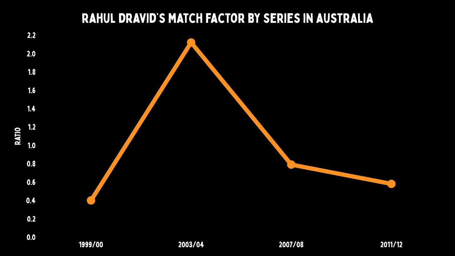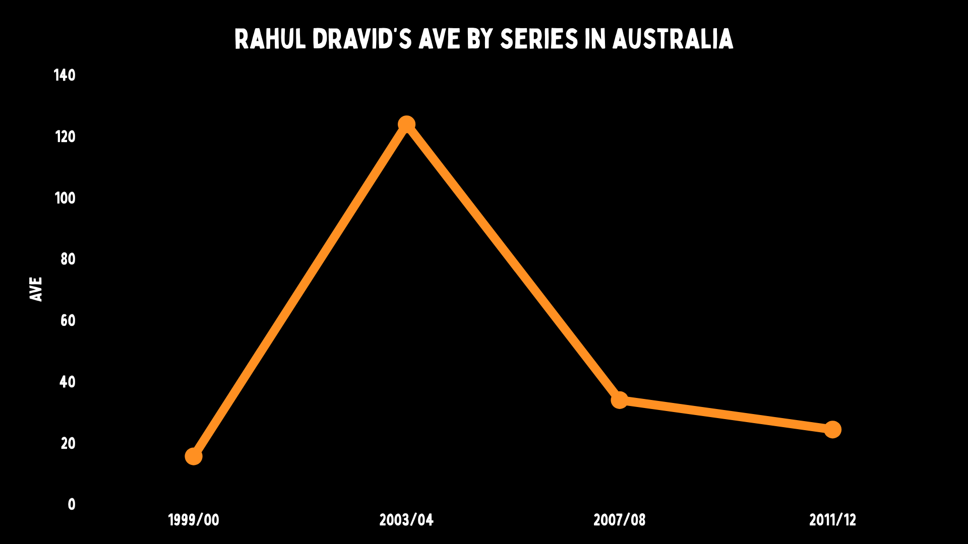 When Dravid first went to Australia, it was on the back of solid tours outside Asia in every single country. However, he could only accumulate 93 runs in his first six innings there, as Glenn McGrath, Shane Warne and a debutant Brett Lee all got him out twice each. In 2007/08, he was pretty middling - this included a tortured innings in Melbourne where he couldn’t even edge the ball behind. And he got out bowled six out of eight times in 2011/12 in what would be his last series for India.