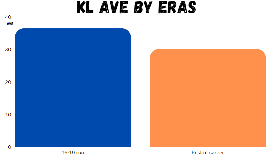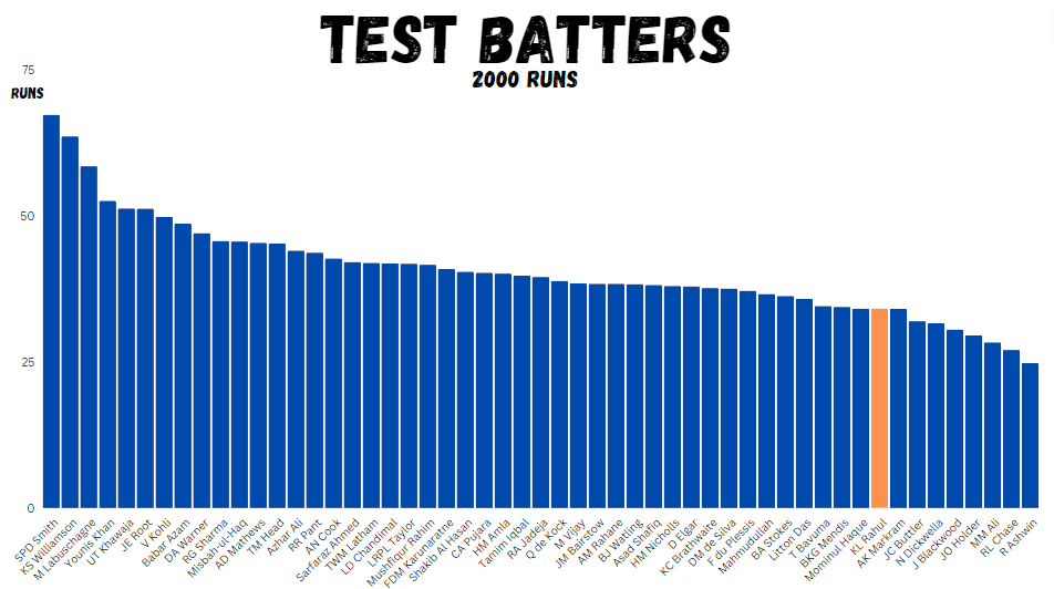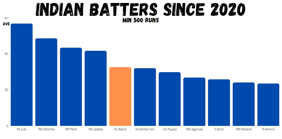 In a moment you will see KL Rahul’s batting average, but it is going to take some time to come up. He isn’t last, that’s Ashwin. But the only specialist batters behind him are Jermaine Blackwood and Aiden Markram. So since 2014, of the players with 2000 runs, you could argue that he is the third worst on average.
