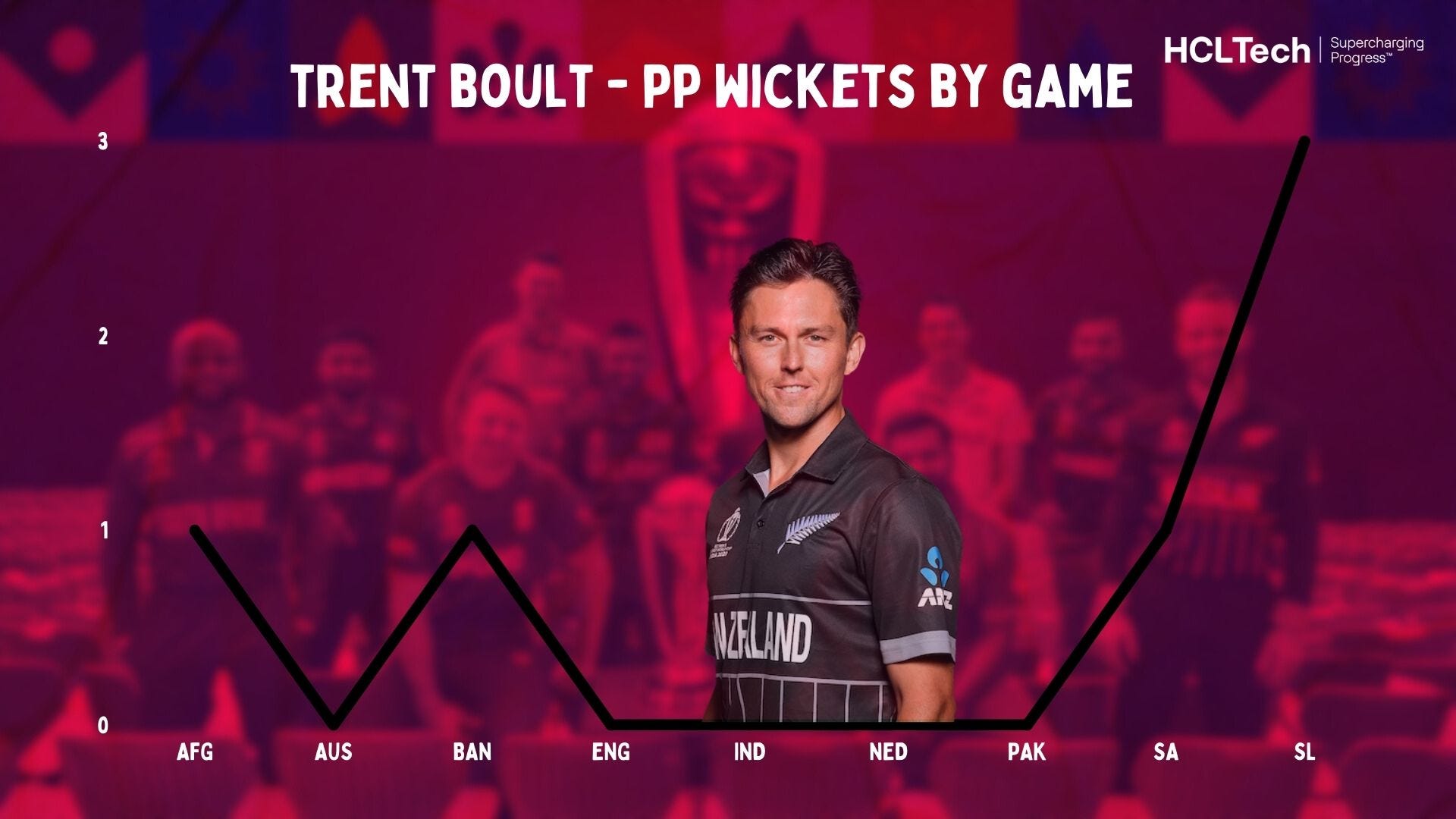 Trent Boult started taking powerplay wickets again. With Matt Henry out, I think it’s pretty unlikely that New Zealand win the World Cup without Boult taking early wickets. He didn’t take a lot of powerplay wickets in the 2019 World Cup either. It’s a couple of times now, yet outside of that, no one seems to be able to hit him.