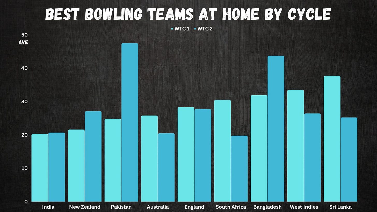 The primary reason for the decline in their performances comes down to the quality of bowling. They went from being the 2nd best bowling team at home in WTC 1 to the 6th best in WTC 2. They just didn’t bowl as well, and this isn’t just being away from home. Their bat-bowl average differential dropped from 24 to 12 - which is a significant fall.